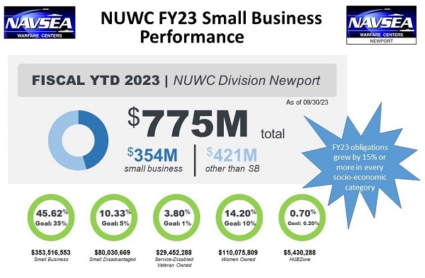 NUWC Division Newport is committed to increasing small business participation and overall competition in its acquisitions. The warfare center fosters networking and prime/subcontractor relationships while striving to meet NAVSEA small business and socio-economic goals by embracing the philosophy “Think Small Business First.” In fiscal year 2023, Division Newport met all of its small business and socio-economic goals for the fifth straight year. The details are in the below chart.