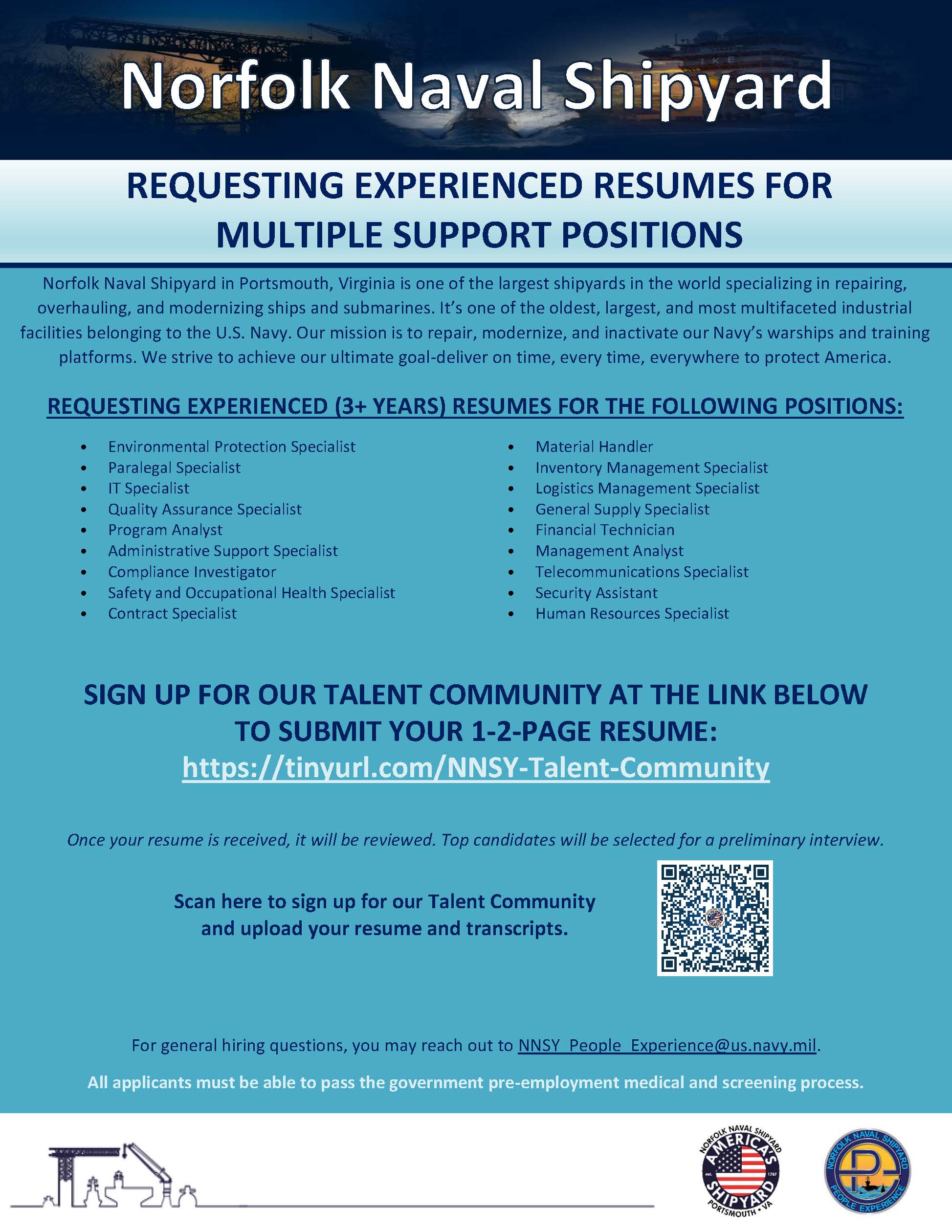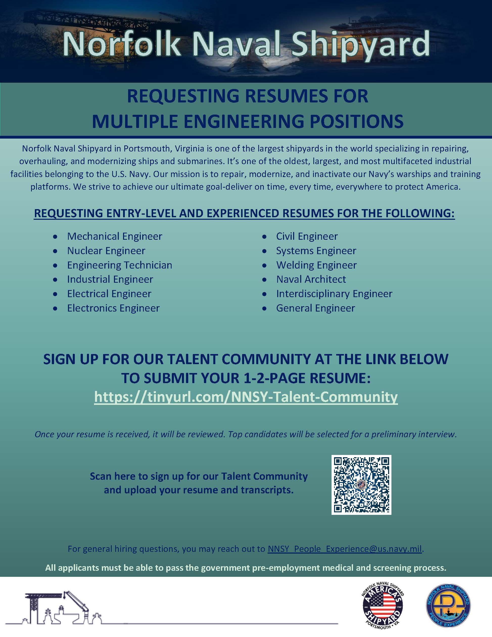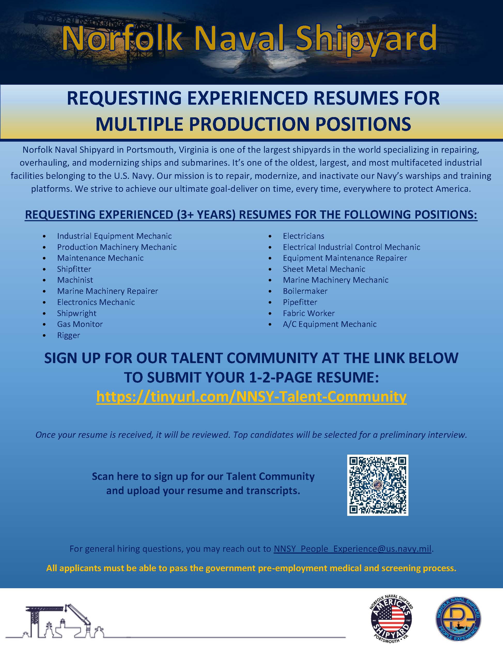 NNSY offers full-time employment in a variety of career fields. We also offer four-year apprenticeships with eligibility at all levels of education and work experience.