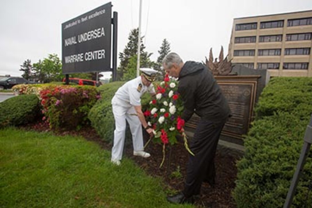Capt. Michael Coughlin, NUWC Division Newport commanding officer, and U.S. Sen. Sheldon Whitehouse place a wreath at a memorial to the 32 men who lost their lives while working for predecessor organizations of NUWC. The ceremony was held after morning colors on Friday, May 26. (U.S. Navy photo/released)