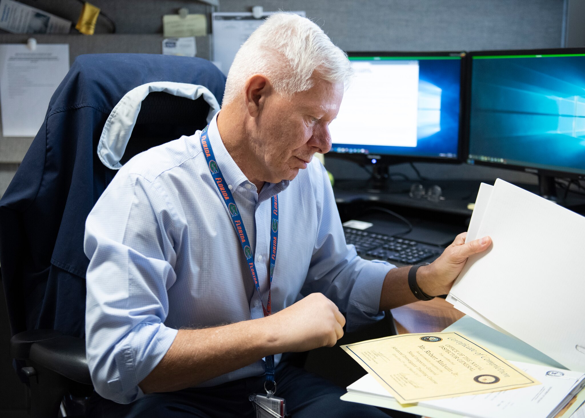 Naval Surface Warfare Center Panama City Division Command Investigations Office investigator Robert L. Malouin, Jr. reviews his certificate of completion that led to his certification as Inspector General Hotline Advanced Investigator. Malouin’s achievement makes him a part of a small group of investigators across the Naval Sea Systems Command enterprise to obtain the distinction.