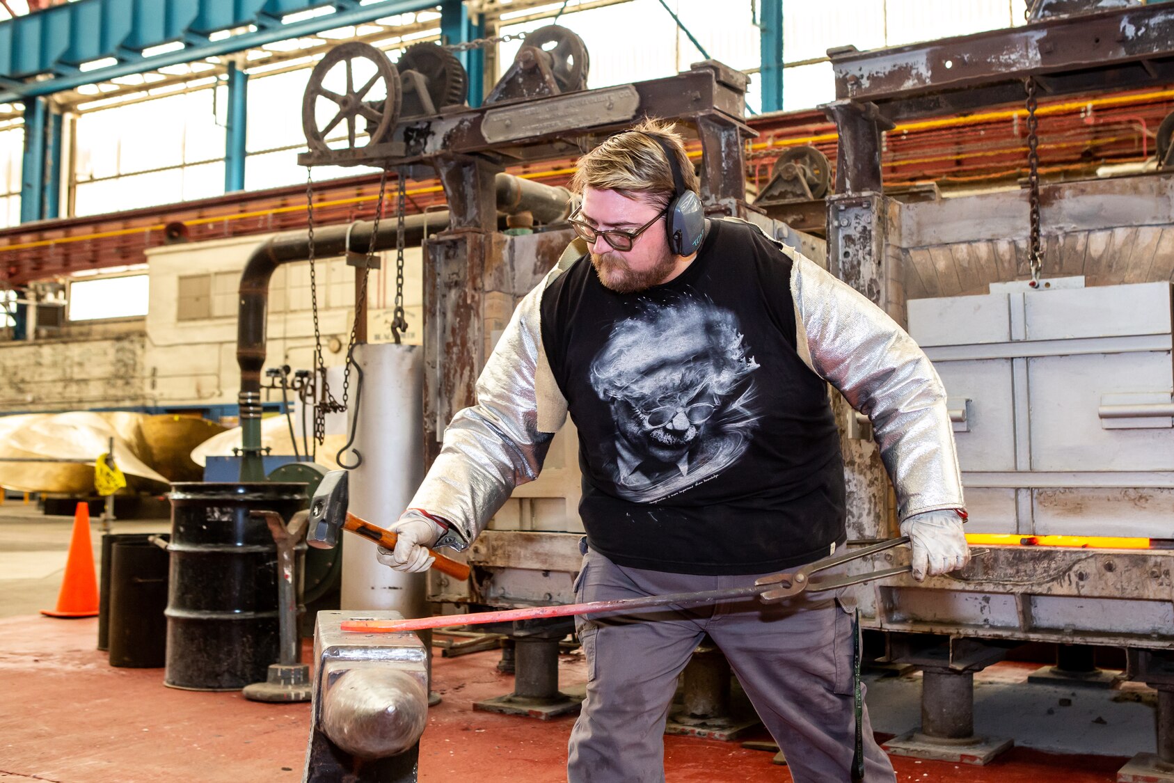 Norfolk Naval Shipyard (NNSY) Forging Shop (Shop 11F) Heavy Forger Chris Kanash works a piece of metal at the forge.