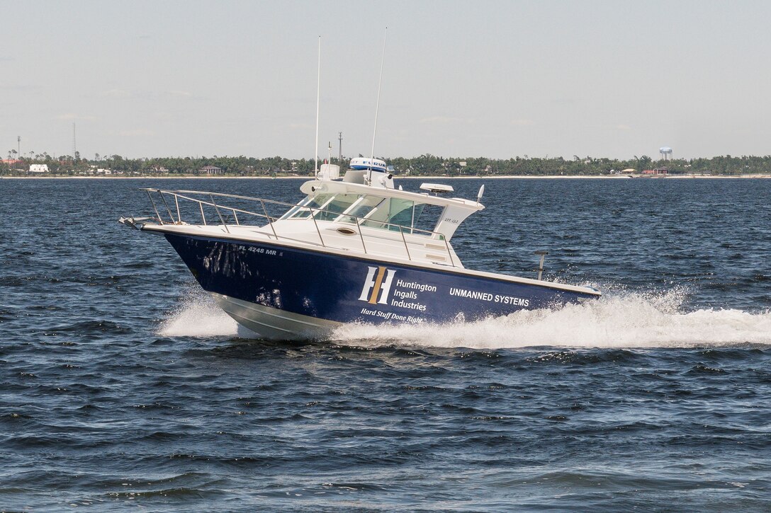 Huntington Ingalls Industries' Proteus unmanned surface vessel (USV) used for testing and development of autonomy capabilities debuts on May 2021. The 27-foot Proteus USV was outfitted with Sea Machines Robotics’ SM300 autonomy system and completed a successful demonstration on Friday, May 14 off the coast of Panama City, Fla. This is the type of vessel that will integrate with Threat Tracker. (courtesy photo)