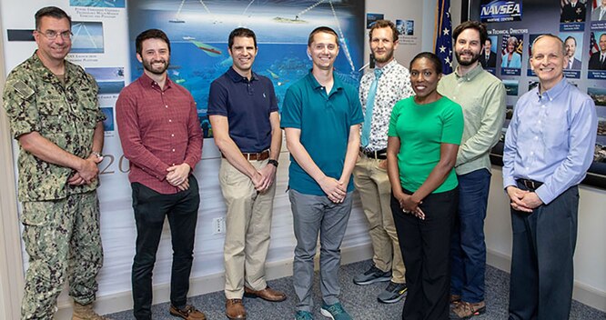 Naval Undersea Warfare Center Division Newport Commanding Officer Capt. Chad Hennings (left) and Technical Director Ron Vien (right) gather with academic fellowship recipients Michael Galuska (from left) of the Undersea Warfare (USW) Weapons, Vehicles and Defensive Systems Department; Christopher Hixenbaugh and Craig Tilton, both of the USW Platforms and Payload Integration Department; Scott Booth of the USW Weapons, Vehicles and Defensive Systems Department; Sherida Jacob of the USW Combat Systems Department; and William Slater of the Sensors and Sonar Systems Department, during a celebration held on July 18, 2022.