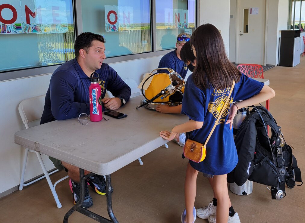 Navy Diver 2nd Class Cameron Duffy, Pearl Harbor Naval Shipyard and Intermediate Maintenance Facility, left, explains how a KM 37 hard hat helmet (diving helmet) works to two children at the shipyard’s demonstration table during the Onizuka Day of Exploration event held at University of Hawaii West Oahu, April 22, 2023. Known as Hawaii's largest STEM event, Onizuka Day of Exploration featured over 100 hands-on activities, workshops, and classes for all ages to enjoy; with a special focus on Hawaiian culture, sustainability, and career development.