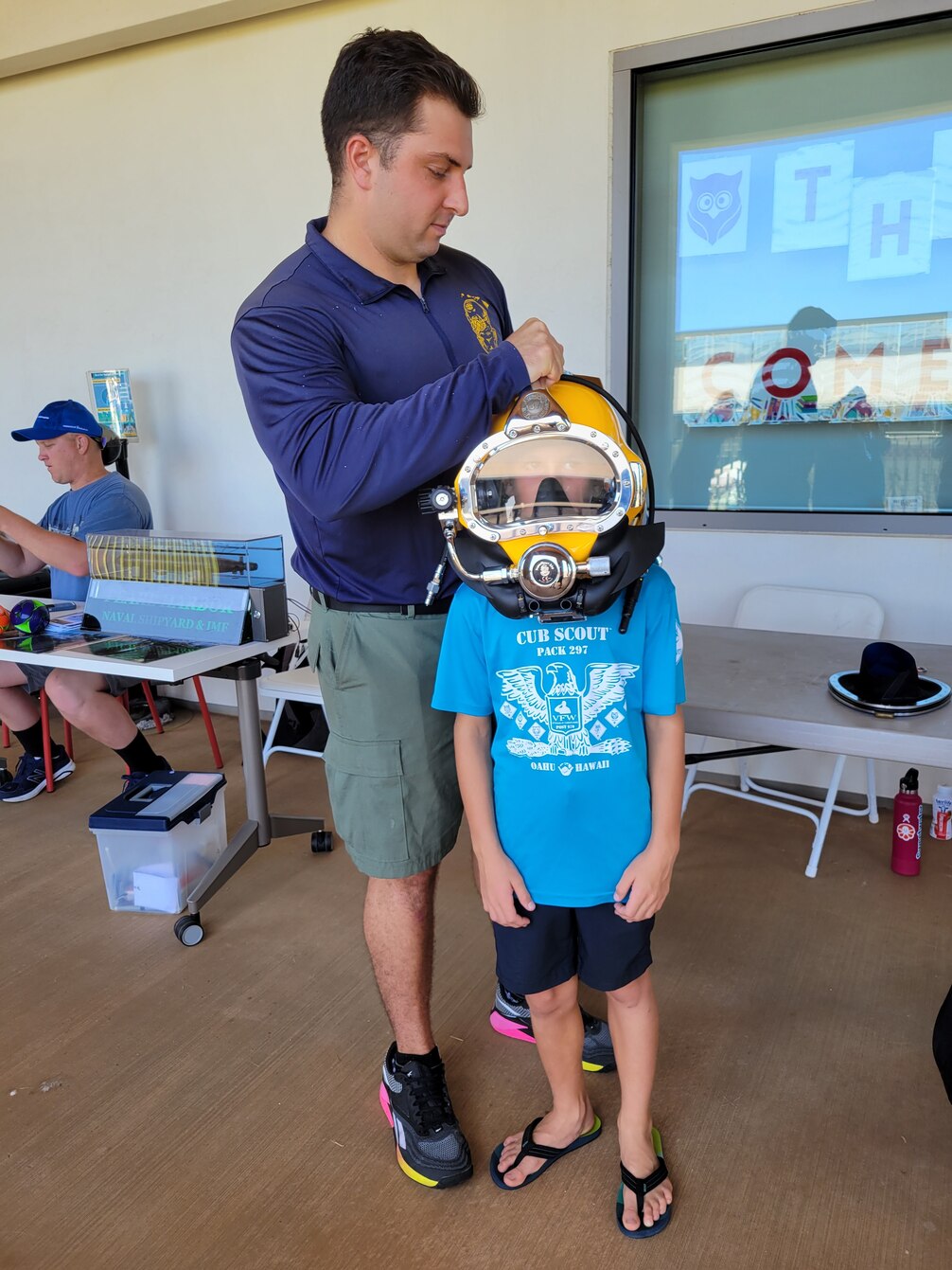 Navy Diver 2nd Class Cameron Duffy, Pearl Harbor Naval Shipyard and Intermediate Maintenance Facility (PHNSY&IMF), left, places a KM 37 hard hat helmet (diving helmet) on a child’s head at the PHNSY & IMF demonstration table during the Onizuka Day of Exploration event held at University of Hawaii West Oahu, April 22, 2023. Known as Hawaii's largest STEM event, Onizuka Day of Exploration featured over 100 hands-on activities, workshops, and classes for all ages to enjoy; with a special focus on Hawaiian culture, sustainability, and career development.