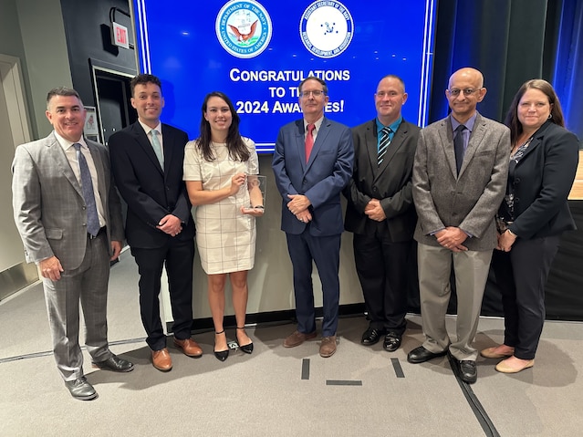 Pictured with Naval Surface Warfare Center Dahlgren Division Technical Director, Dale Sisson Jr., P.E., SES and Integrated Engagement Systems Department Head Shellie Clift are Dr. Udayan Bhapkar, Lindsey Klunder, James Latourell and William "Jack" Smith members of the Aurora Software Foundry Joint Laser Deconfliction Safety Software Team and Cory Willoughby, member of the AN/SPY-6(V) 1 Radar Aegis Baseline 10 Test Team. Both teams were recognized as winners of the Assistant Secretary of the Navy for Research, Development and Acquisition Dr. Delores M. Etter Top Scientists and Engineers of the Year Award for 2024. The teams were honored during a ceremony at the Pentagon, June 12.