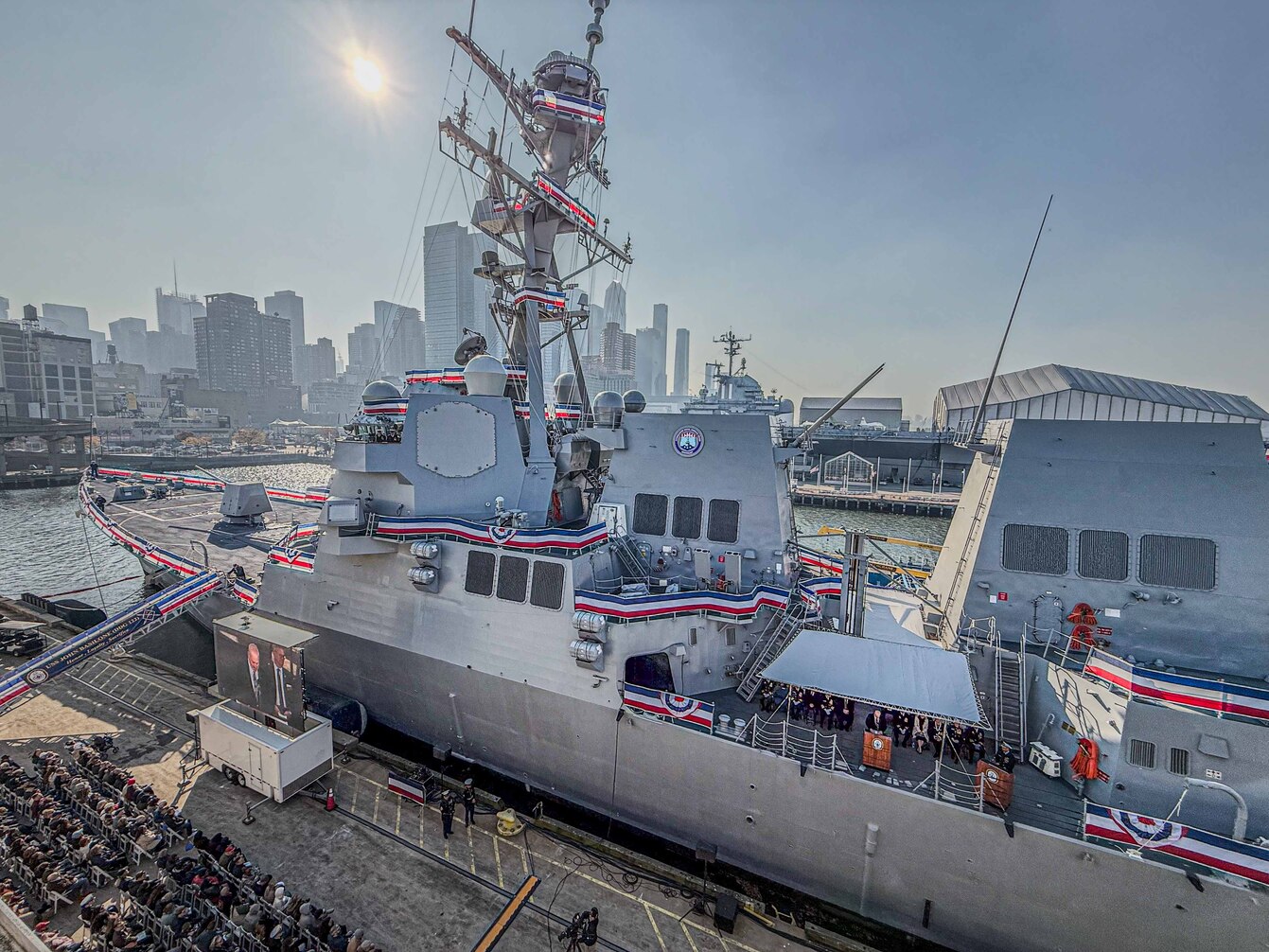 NEW YORK CITY, New York – The crew of the Navy’s newest Arleigh Burke-class guided-missile destroyer, USS John Basilone (DDG 122), “manned the ship and brought her to life” during a commissioning ceremony held in New York, Nov. 9, 2024. Bob Nees, the engineering manager for Surface Warfare Systems for Electromagnetic Environmental Effects Technical Warrant Holder at Naval Surface Warfare Center Dahlgren Division, helped develop a solution to address an electromagnetic interference issue before the Navy could accept the Basilone. (Mass Communication Specialist 2nd Class Theoplis Stewart II/U.S. Navy photo)