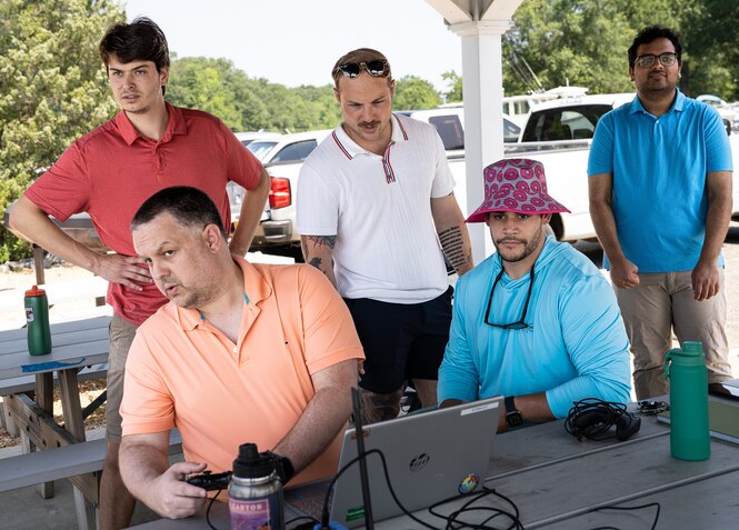 Naval Surface Warfare Center Dahlgren Division (NSWCDD) engineers Jeremiah Brown (seated left), (standing from left to right) James Caputo, Spencer Miller and Rishi Patel monitor their BlueBoat as it runs its mission in Machodoc Creek during a Workforce Development Innovation Challenge. NSWCDD scientist Luis Valcourt-Colon (seated right) from the Weapons Control and Integration Department’s Unmanned Control Systems Branch served as a mentor for the challenge. (Dave Ellis/NSWCDD Photo)