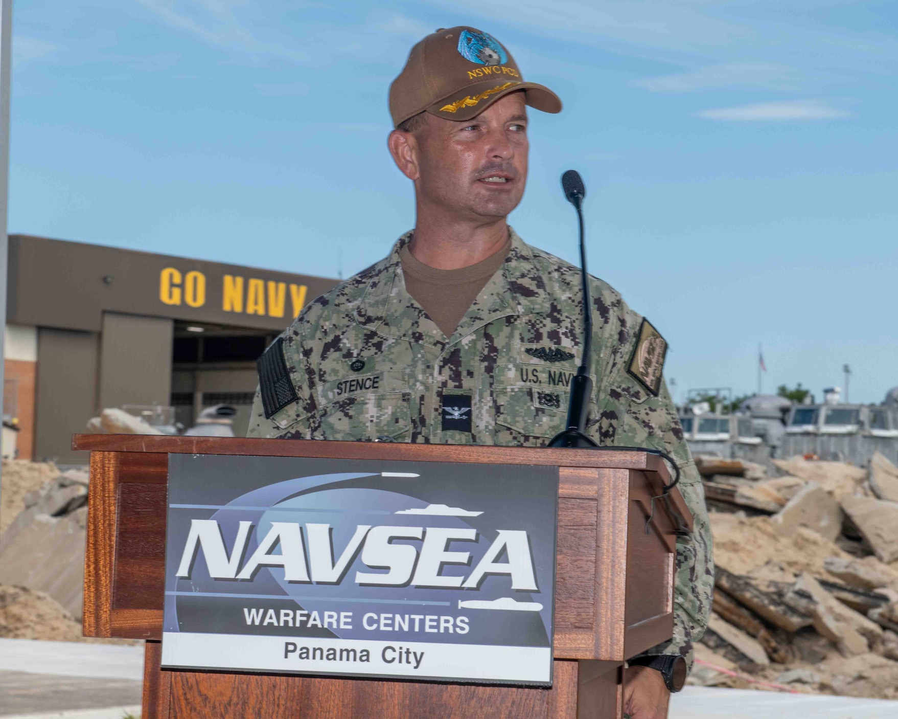 Naval Surface Warfare Center Panama City Division Commanding Officer Capt. Paul Stence, Jr., addresses the crowd at the NSWC PCD Subsea & Seabed Warfare Facility, July 9. He praised the hard work and dedication of countless individuals who are supporting the warfighters both now and, in the future, through this project. (U.S. Navy photo by Eddie Green)
