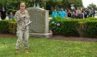 Naval Undersea Warfare Center Division Newport Commanding Officer Capt. Chad Hennings welcomes attendees to Bring a Child to Work Day ahead of morning colors held on the campus on June 27, 2025. Roughly 250 youngsters, ages 9 to 17, and 150 parents and guardians participated in the day-long event designed to introduce family members of the employees to the science, technology, engineering and mathematics (STEM) work conducted at the warfare center.