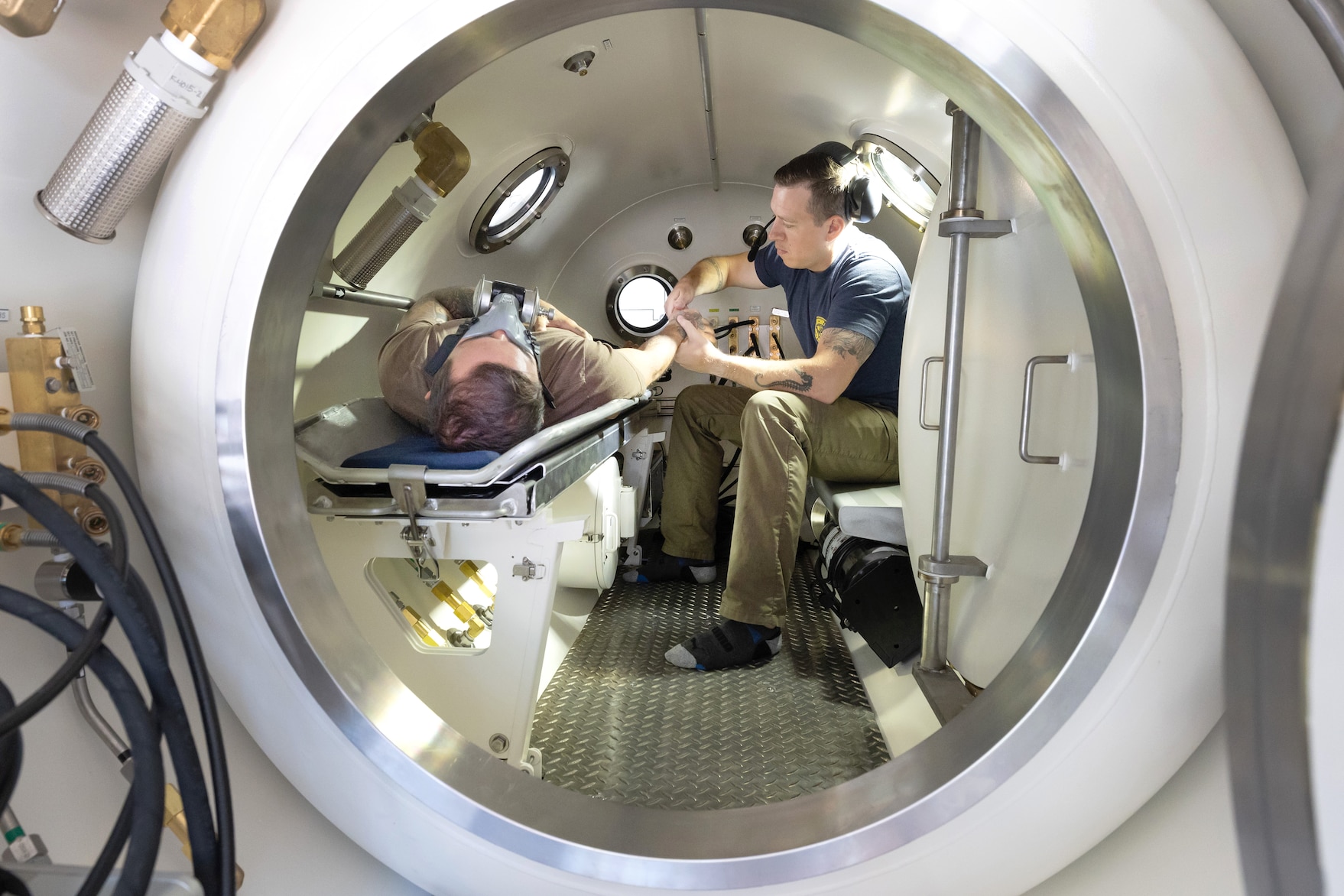Navy Diver 1st Class Josh Amberson, right, and Navy Diver 2nd Class Hale Gage conduct a simulated emergency inside the new hyperbaric chamber, July 29, 2025, at Naval Base Kitsap-Bangor, Washington. (U.S. Navy photo by Wendy Hallmark)