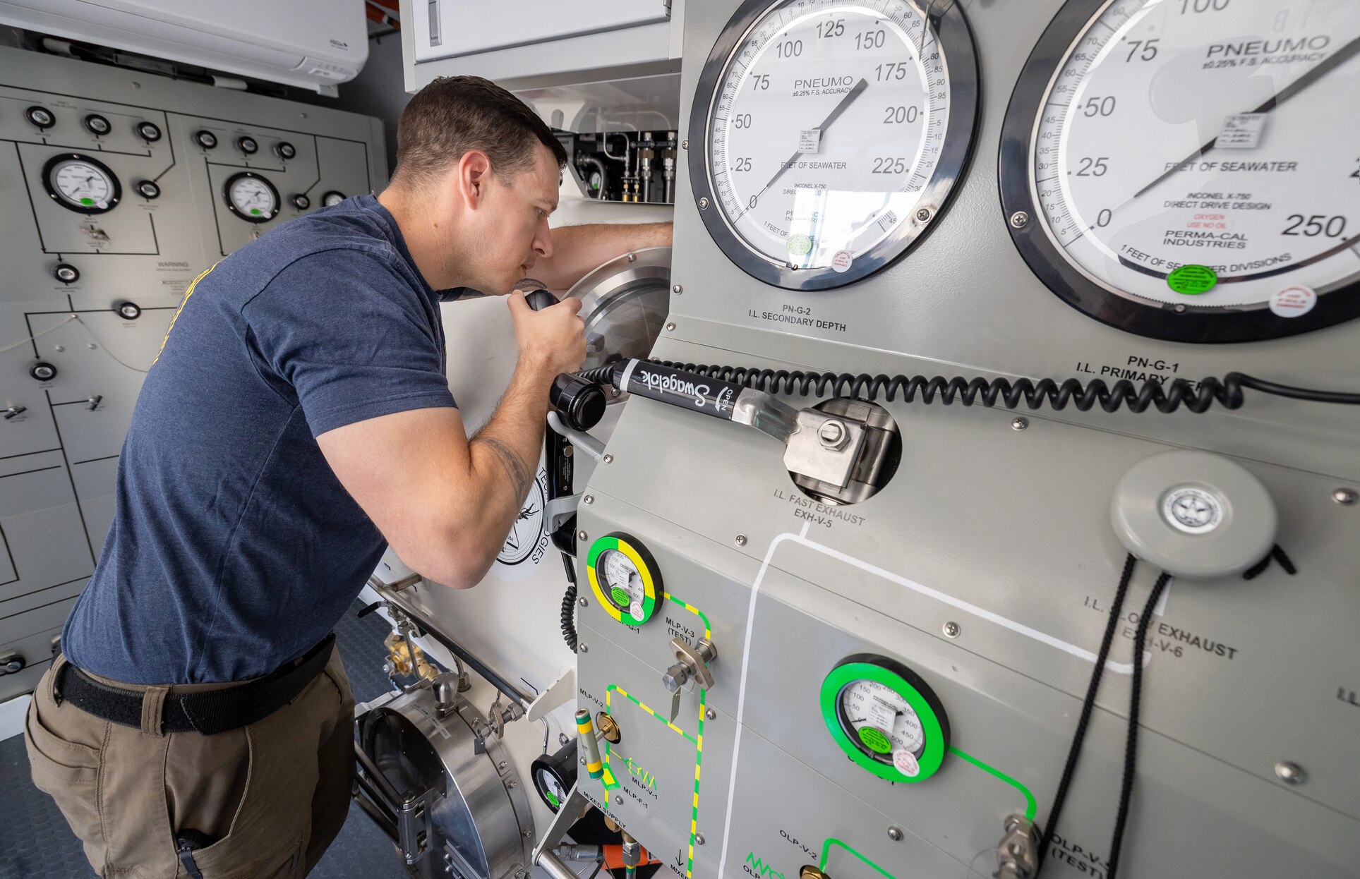 Diver 1st Class Josh Amberson communicates with divers inside the new hyperbaric chamber July 29, 2025, during a simulated emergency at Naval Base Kitsap-Bangor, Washington. (U.S. Navy photo by Wendy Hallmark)