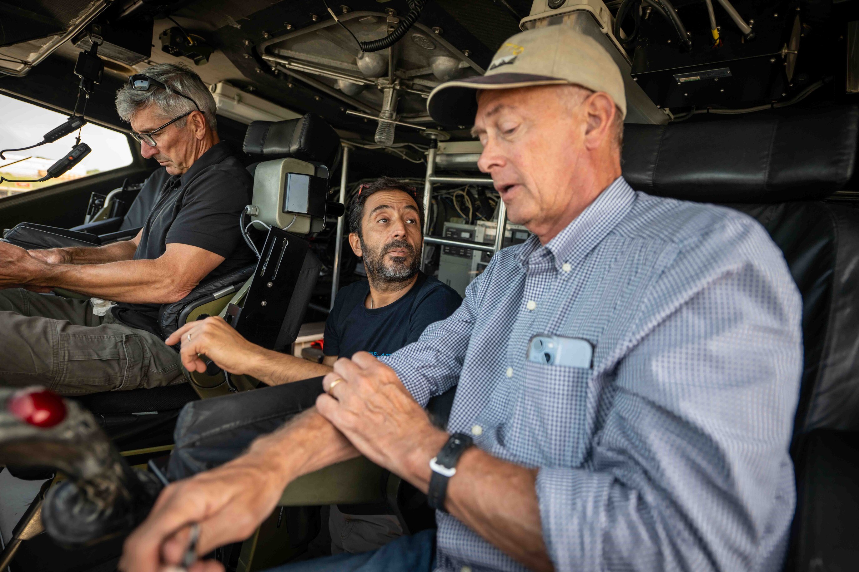 From left, Captain Al Frontin, Amitai Peleg, SEALARTEC CEO, and Dennis Danko, Stiletto Program Manager, discuss logistics of an autonomous boat launch and recovery demonstration in the pilothouse Stiletto in Norfolk, Virginia, on June 2, 2025. Naval Surface Warfare Center, Carderock Division’s Joint Prototyping and Experimentation Maritime (JPEM) Stiletto Program demonstrated a new system developed by SEALARTEC for autonomously launching and recovering small boats. The Stiletto program provides a unique, cost-effective, and efficient way to deliver combat systems to the warfighter at an accelerated rate, drastically improving delivery of critical needs for mission readiness. Carderock, the Navy's innovation and ship design powerhouse, is a world-class research and development facility specializing in critical ship design and components. (U.S. Navy Photo by Travis Troller)