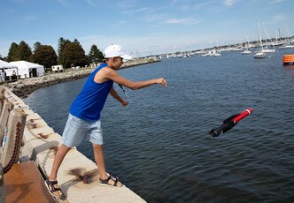 An attendee at the 2025 Blue Technology Innovation Demonstration Event (BlueTIDE) held at Sail Newport and the Naval Undersea Warfare Center Division Newport’s Narragansett Bay Test Facility, tosses a vehicle developed by Jaia Robotics into Newport Harbor at Fort Adams State Park for an in-water demonstration on Aug. 28, 2025. Hosted by Division Newport’s Northeast Tech Bridge in conjunction with nonprofit partner 401 Tech Bridge, BlueTIDE connects innovative businesses with U.S. Navy scientists and engineers and Department of Defense stakeholders to facilitate rapid delivery of capabilities to the warfighter.