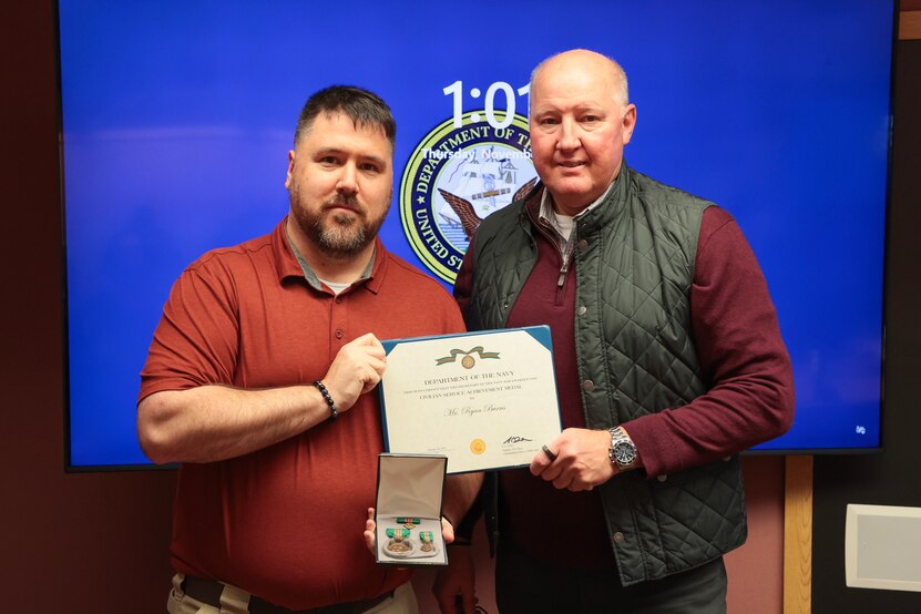 Naval Surface Warfare Center Indian Head Division Security Director Bill Gregor (right) presents Security team member Ryan Burns with the Civilian Service Achievement Medal in Indian Head, Md. (U.S. Navy photo Released)