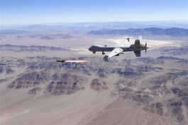 CREECH AIR FORCE BASE, Nev. – An MQ-9 Reaper remotely piloted aircraft conducted a flight over the Nevada Test and Training Range and successfully fired an AGM-114 Hellfire missile. The first use of the Battle Management System’s universal armament interface software was on the MQ-9 Reaper. (U.S. Air Force Photo by Airman 1st Class Victoria Nuzzi)