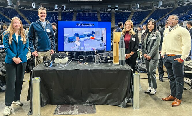 PENN STATE, Pa. – Penn State engineering students Victoria Walker, Keller Mardis, Lauren Hayden, Yixi Wang and Jackoy Gayle developed a custom end-of-arm tool prototype capable of picking up a Mark 45 5-inch round. Naval Surface Warfare Center Dahlgren Division sponsored the capstone project, which brought a fresh perspective to NSCWDD engineers working to make ammunition handling safer, faster and more sustainable for today’s fleet. (Provided photo)