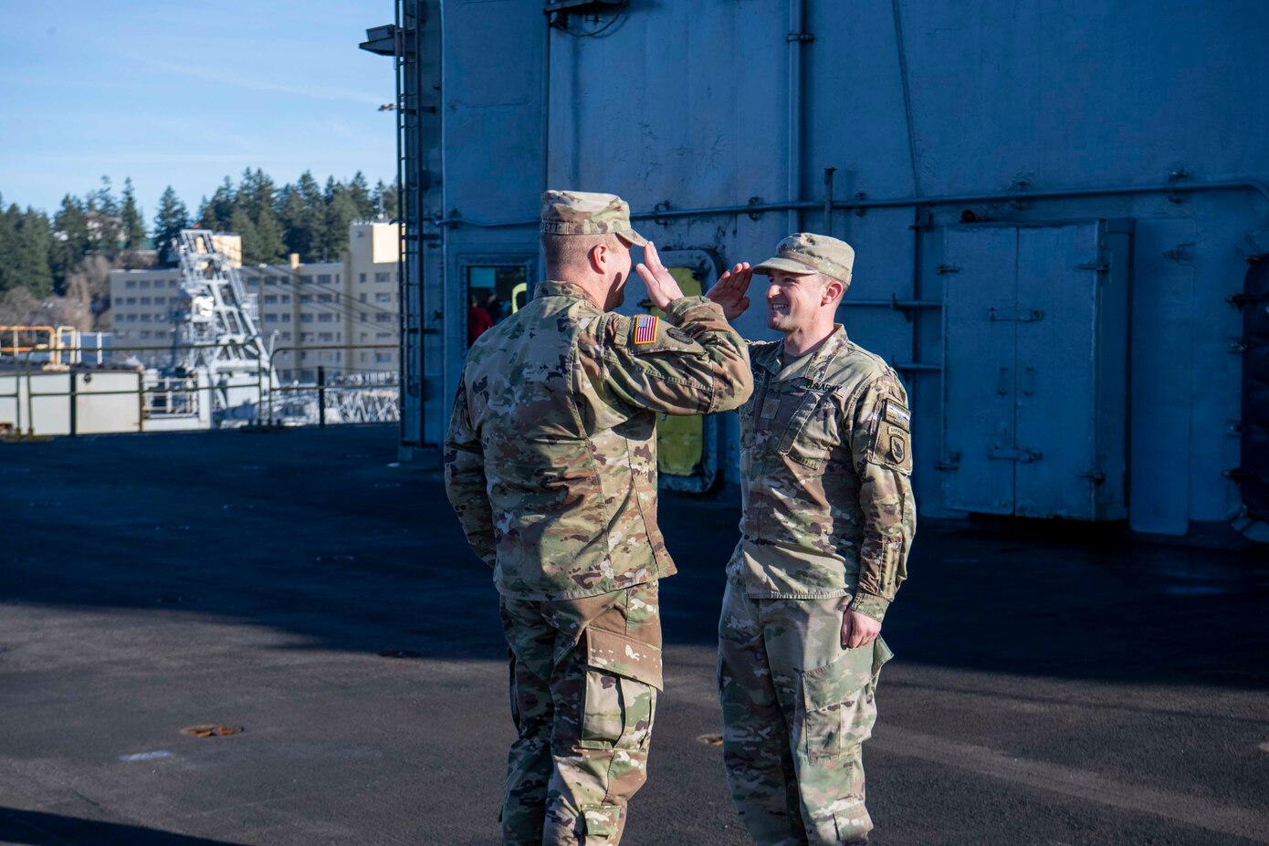 U.S. Airmen and U.S. Soldiers conduct a promotion ceremony aboard the Nimitz-class aircraft carrier USS Nimitz (CVN 68) in Bremerton, Washington, Jan. 16, 2026. Nimitz is in port for a scheduled maintenance availability. (U.S. Navy photo by Mass Communication Specialist 2nd Class Timothy J. Meyer)