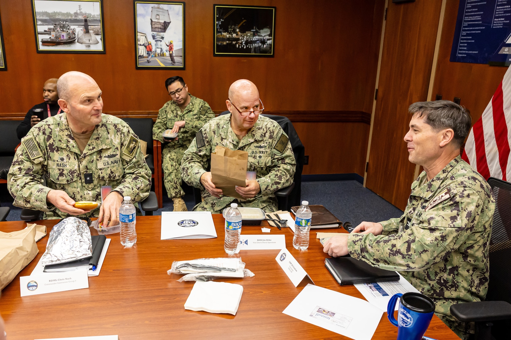 Adm. John Kilby, vice chief of naval operations (middle), and Rear Adm. Christopher Nash, commander, Submarine Group Nine, meet with Capt. JD Crinklaw, commander, Puget Sound Naval Shipyard & Intermediate Maintenance Facility, Jan. 23, 2026, in Bremerton, Washington. (U.S. Navy photo by Jeb Fach)
