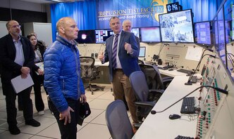 Rhode Island Secretary of Commerce Stefan Pryor (from left), Elaine Bryant of Divergent Technologies, and Kevin Czinger, founder and executive chairman of Divergent Technologies, a California-based additive manufacturing company, listen to Naval Undersea Warfare Center Division Newport’s Chief Technology Officer Dr. Jason Gomez explain the work executed in the Propulsion Test Facility during a tour held on Jan. 16, 2026.