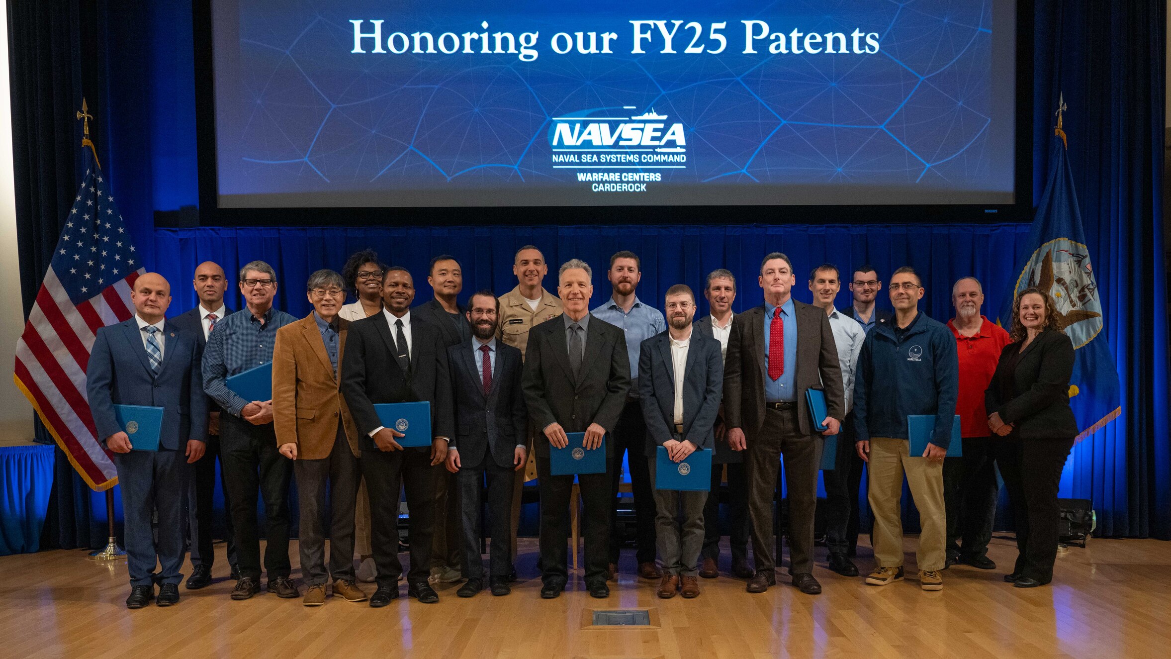 Inventors from Naval Surface Warfare Center Carderock Division gather for the FY25 Patent Awards Ceremony, where the command recognized employees whose innovations were issued U.S. patents over the past year. The event highlights Carderock’s ongoing commitment to cultivating and celebrating technical creativity across the workforce. (U.S. Navy photo by Corum Byers.)