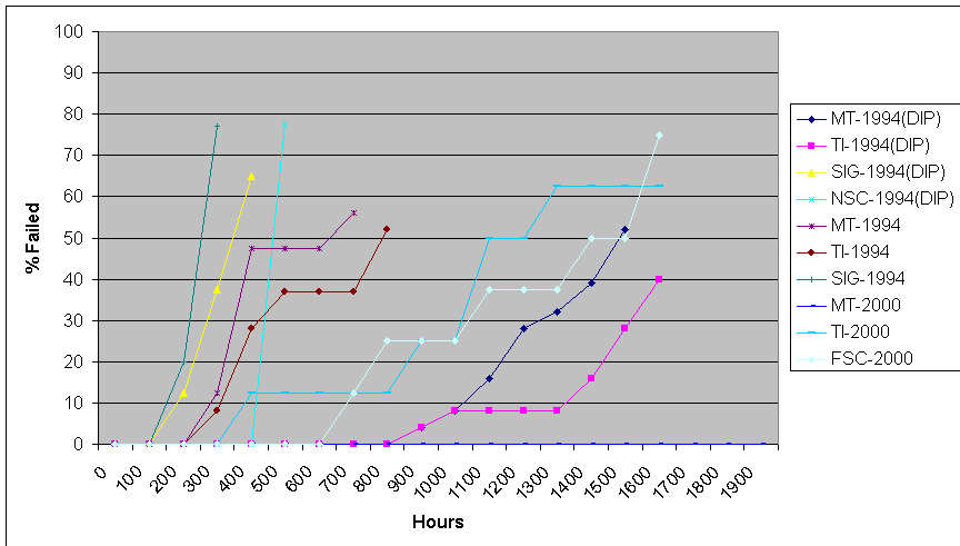 Figure 3 illustrates the HAST evaluation results. The desired 50% failure rate could not be attained in this evaluation because of lead integrity problems that made electrical contact almost impossible. The HAST evaluation ran for a total of 1300 hours. PEM HAST performance was manufacturer dependent. The preconditioning level had an inconsistent impact on the HAST results. HAST is a tool that will determine if materials’ incompatibilities are present within a device. This evaluation proved that manufacturers have more finely tuned their recipe for epoxy molding compounds. No earth shattering results were exhibited from this evaluation. The results from this evaluation were somewhat better than the previous evaluation.