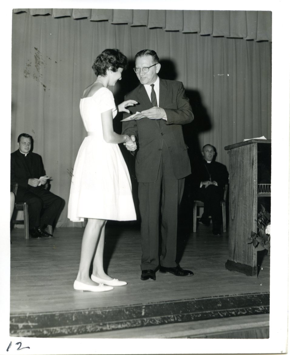 Mr. Settle handing an award to Carole Lamonica, 1962.