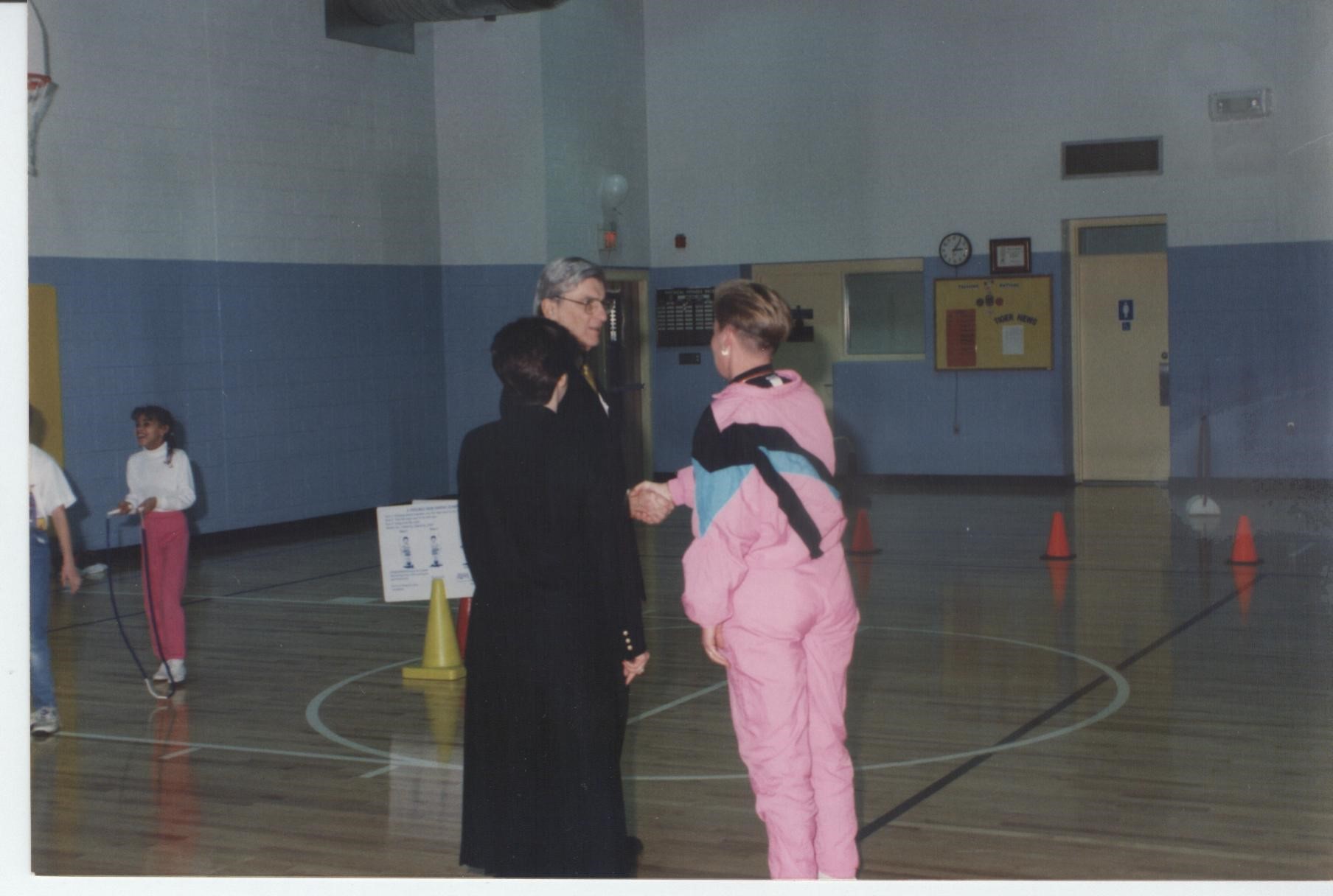 Sen. Warner returns in early 1990s to see the new gym, part of the expansion project he endorsed.