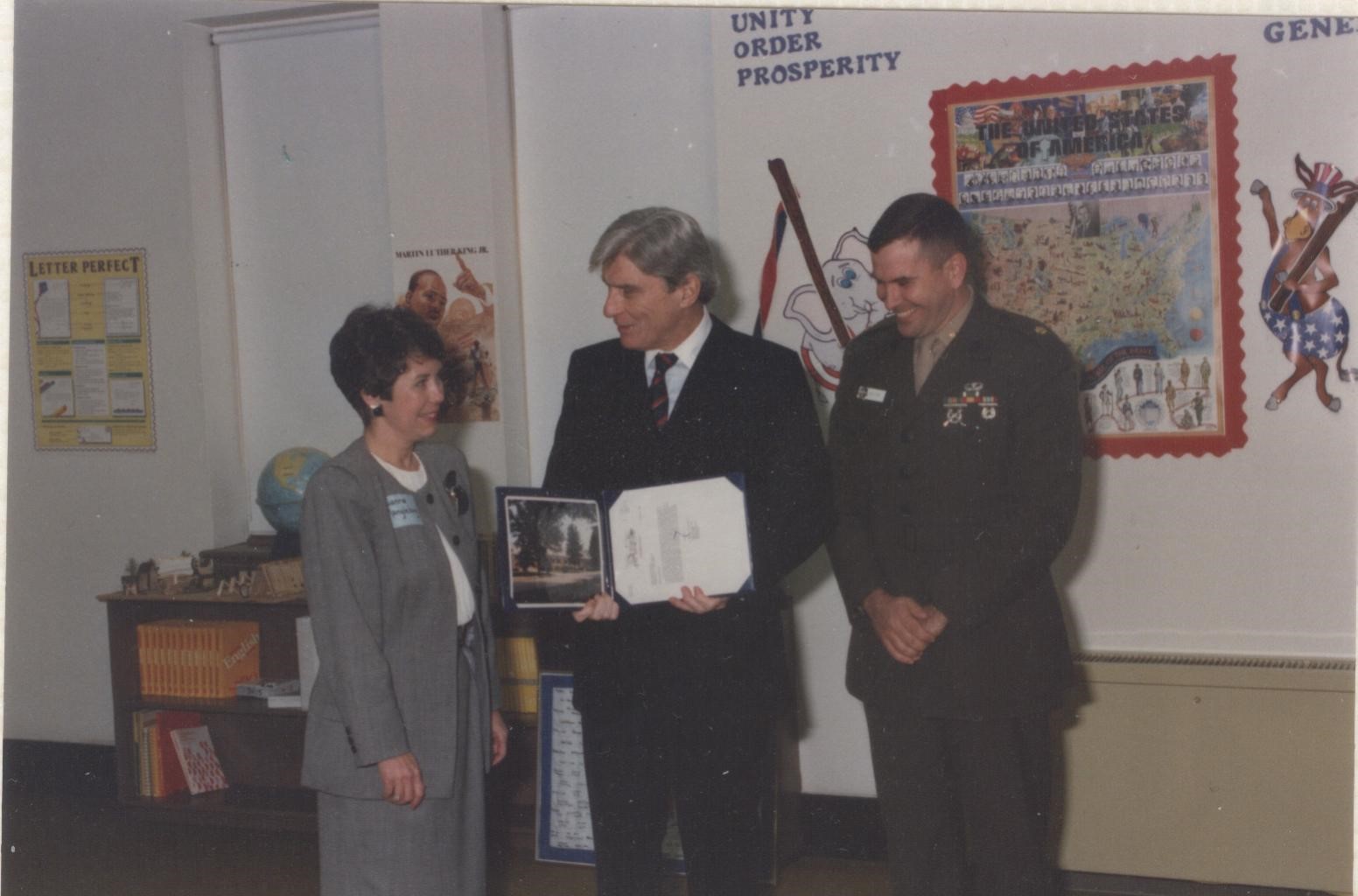 Left to right: Principal Mangleburg, Sen. John Warner, and school board president, LTC George Rector.