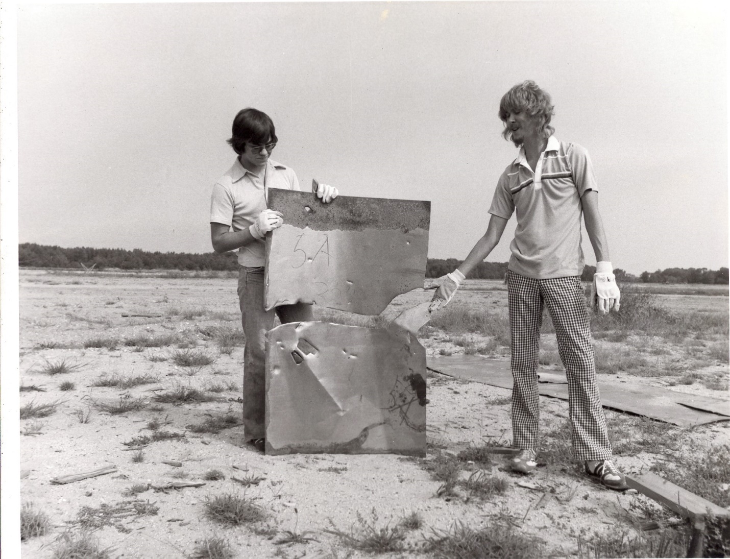 Figure 1. Fieldwork at Pumpkin Neck (left, Charles Garnett; right, Rocky [?], hold a steel plate cut in half by a continuous rod warhead.