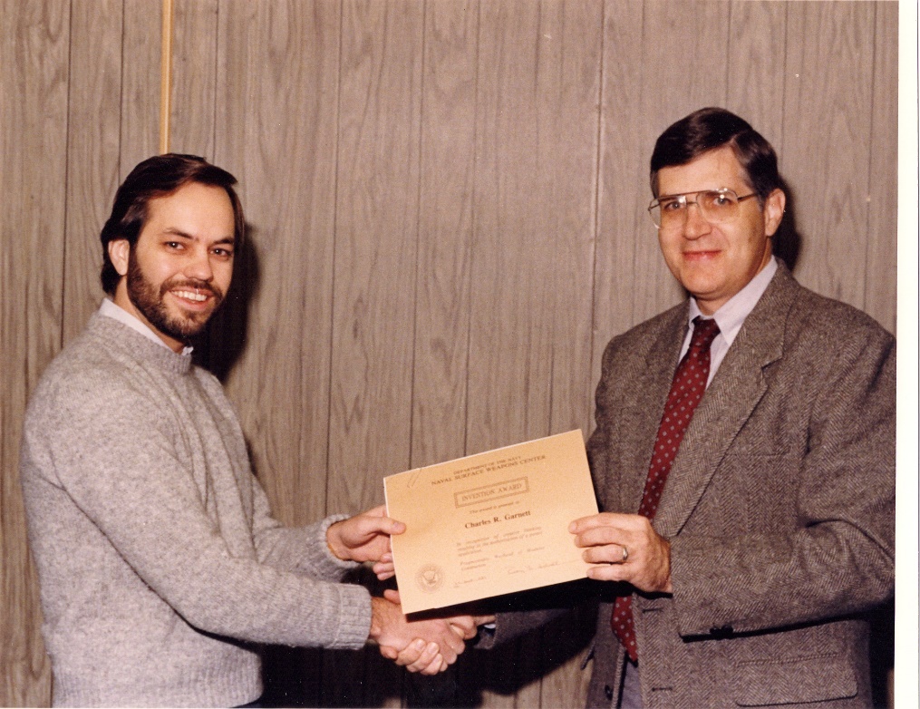 Figure 5. 1987 Warhead Invention Award: Charles Garnett (left) receives the award from Branch Head Walter Hoye.