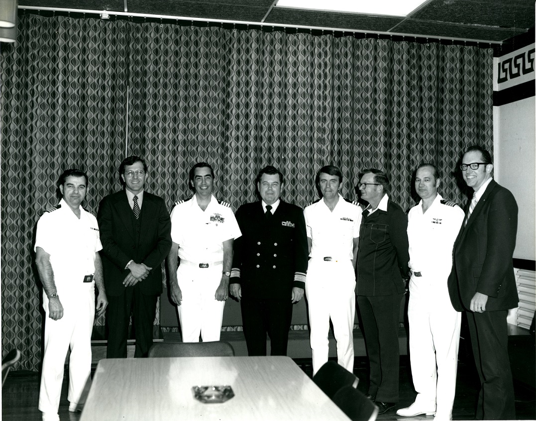 1976. Pictured, left to right, after the Aegis Combat Systems Lead Laboratory Program Review, are: CAPT Robert C. Beers, Manager, Aegis Weapon System; Dr. Thomas A. Clare, Head Aegis Combat Systems Division; CAPT Dwight M. Agnew, Jr. OIC and Asst. Commander; RADM Wayne E. Meyer, Project Manager, Aegis Combat Systems; CDR L. Todd Blades, Aegis Dahlgren Area Commander and Asst. Head, Combat Systems Integration Dept.; Mr. Colvard; CAPT Raymond D. Bennett, Aegis Deputy Project Manager, and Mr. David B. Colby, Head, Combat Systems Integration Department.