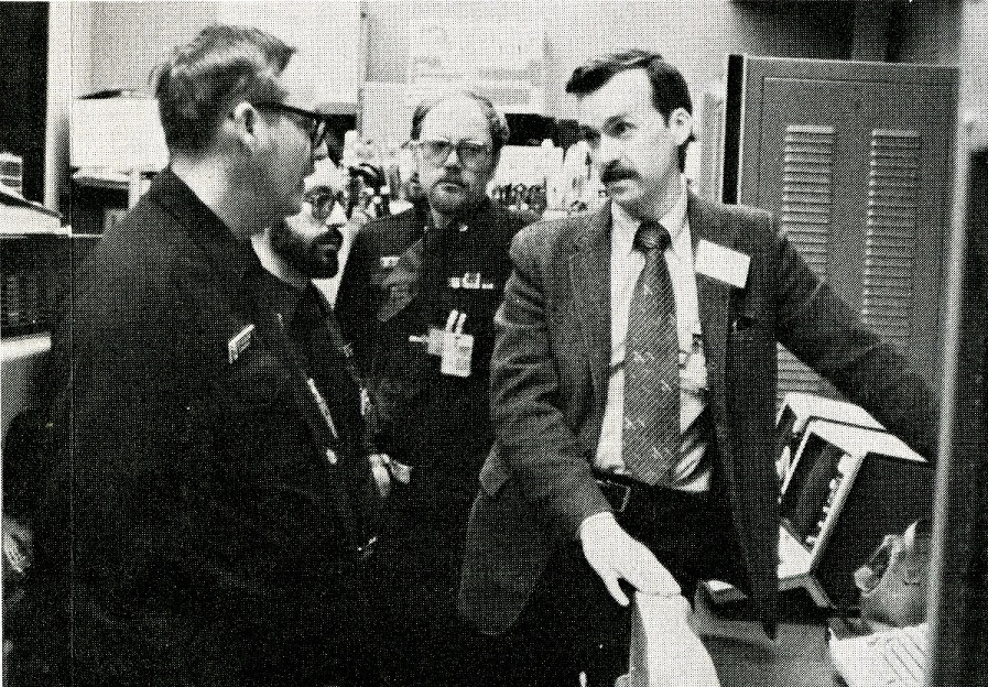 Cyrus Hutchings (left) and Phil Herron conduct tour of Aegis Computer Center, 1984.