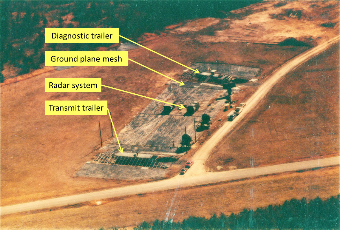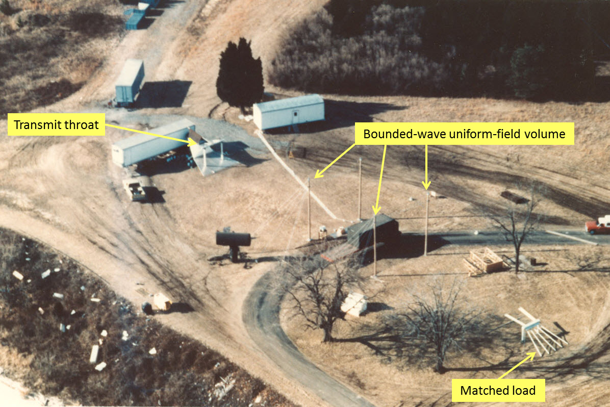 The Hertzian-type devices were typically connected to a simple antenna and oscillated at relatively low frequency, usually below 100 Mhz. Higher frequencies were difficult because the systems had to be smaller and store less energy. Air breakdown was often the limiting power factor. Measuring the output field of these devices was difficult because of ground effects, so a 100-meter ground plane of welded wire was laid out in a field with semi-underground trailers at each end to house high-voltage generators and diagnostics as shown in the figure below. This came closer to an ideal measurement system. The sources often produced over a gigawatt of peak power and field strengths of several kV/m at the target sites.