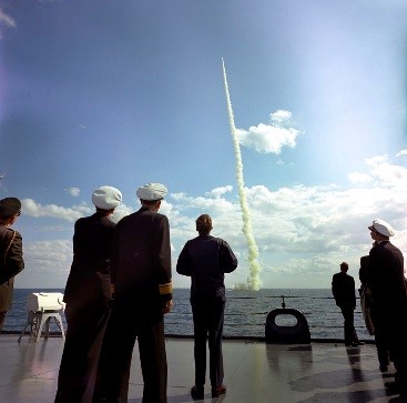 During a 16 November 1963 visit aboard USS Observation Island (EAG-154), President John F. Kennedy, center, watches a USS Andrew Jackson (SSBN-619) demonstration of the firing of a Polaris A-2 missile off the coast of Florida. (Robert Knudsen, White House Photographs, John F. Kennedy Presidential Library and Museum, Boston)