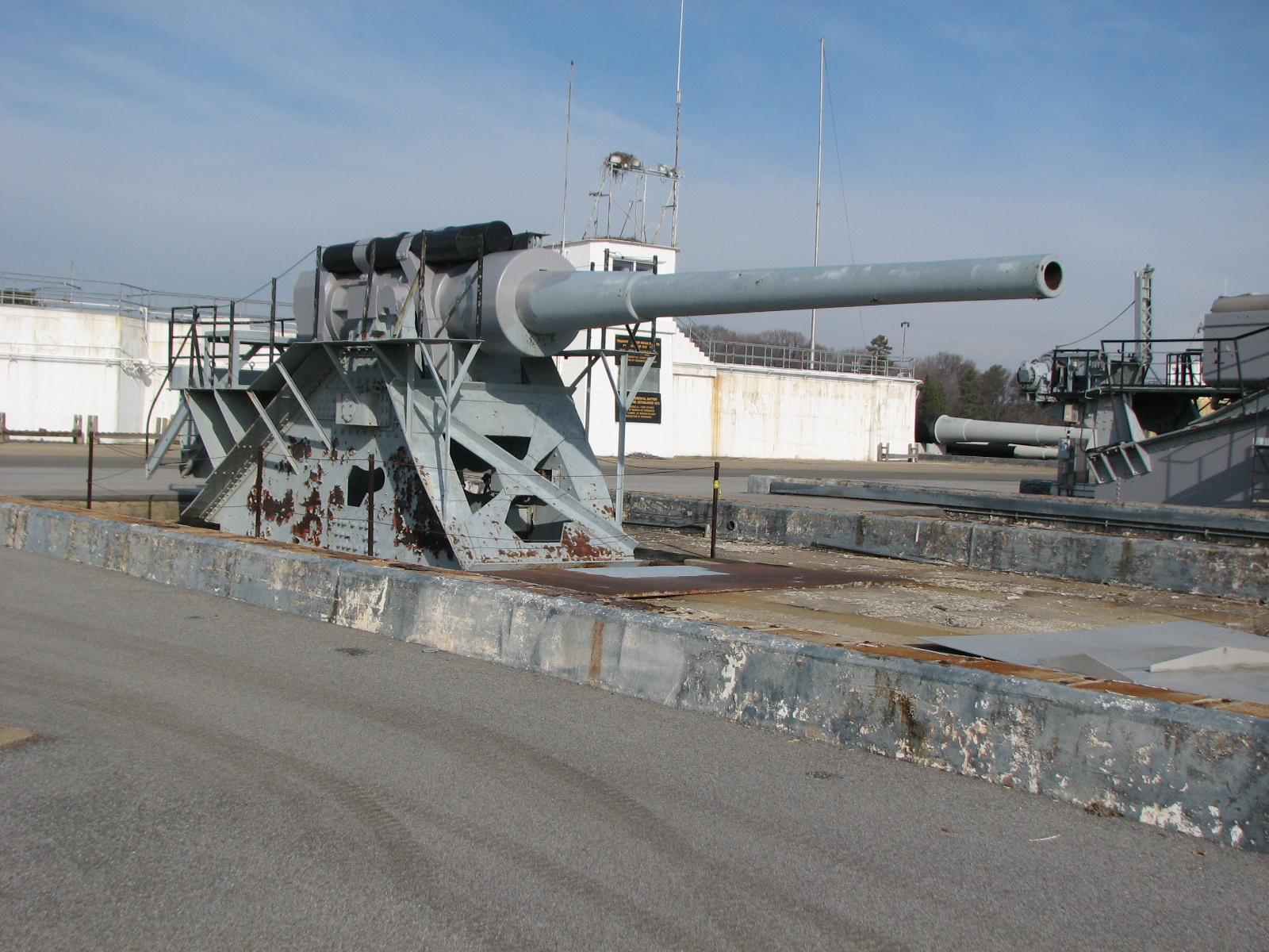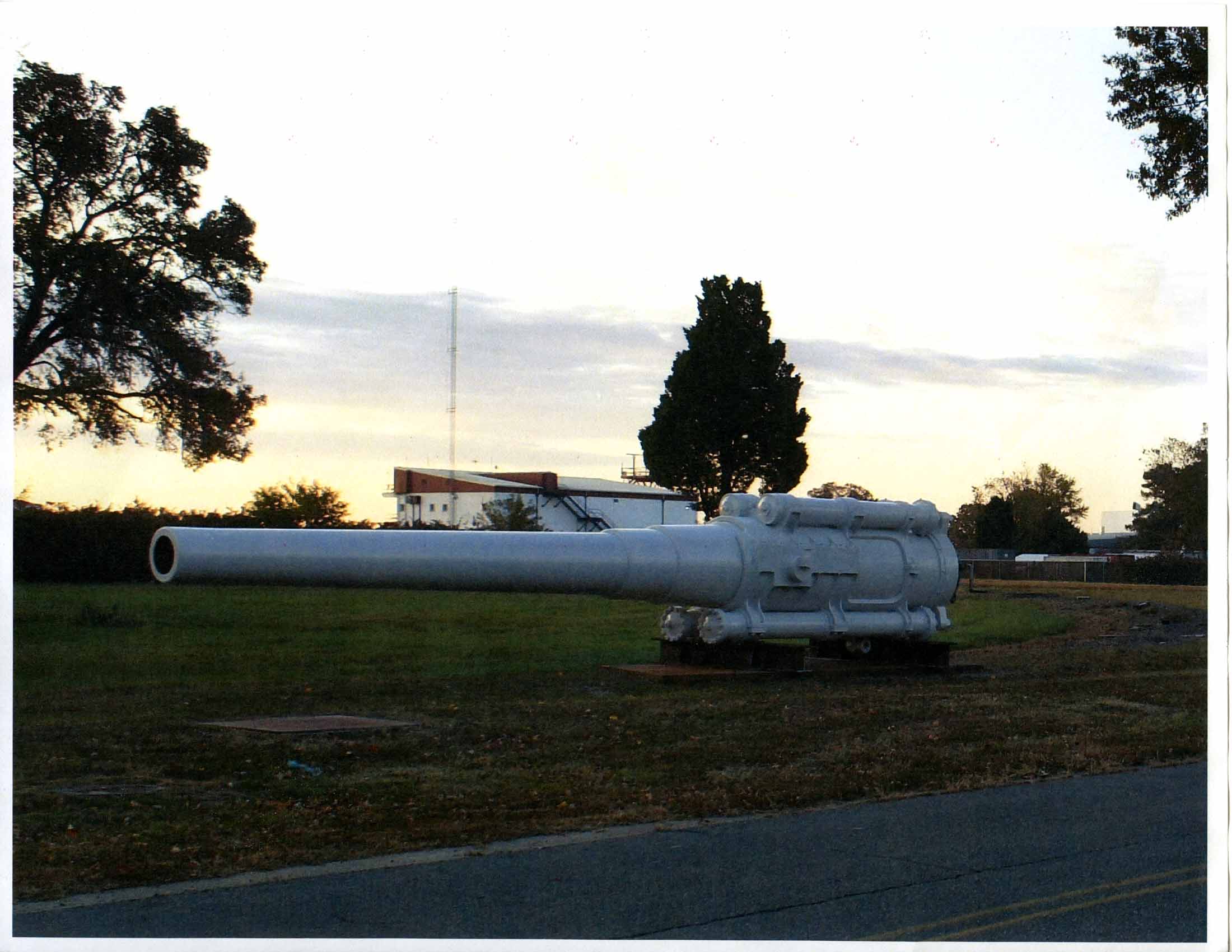 On Tisdale Road and across from Dahlgren Road is the 16-inch, 28.8-caliber gun. This gun was originally manufactured as the 13-inch, 35-caliber Mark II Gun in 1898. Although not in its original configuration, it is the oldest American battleship main battery gun in existence. The gun was originally part of the four-gun main battery aboard one of the Kearsarge (BB-5)-class or Illinois (BB-7)-class battleships. All five American battleships, armed with 13-Inch Mark II guns, participated in the 1907–1909 Great White Fleet world tour. The gun was converted to its present configuration so that Dahlgren would have a dedicated 16-inch gun for use at Plate Battery for testing armor-piercing projectiles, base fuzes, and armor plate. The gun was also used to test 970-pound experimental bombs in 1955. During its career as a test asset, this rifle fired a total of 26 rounds.