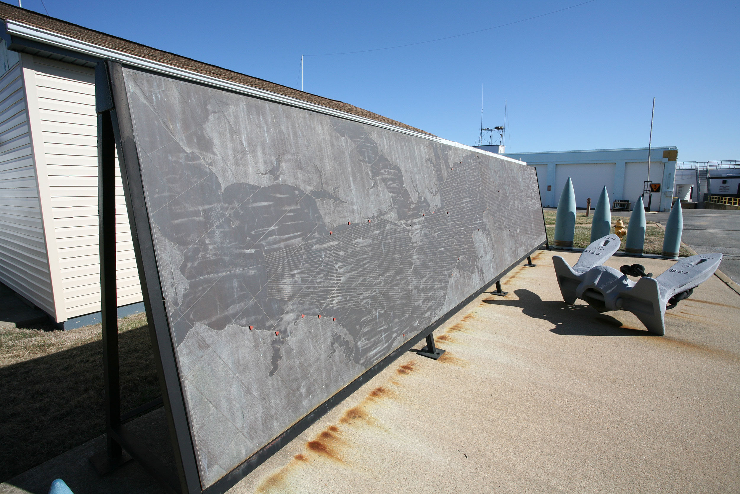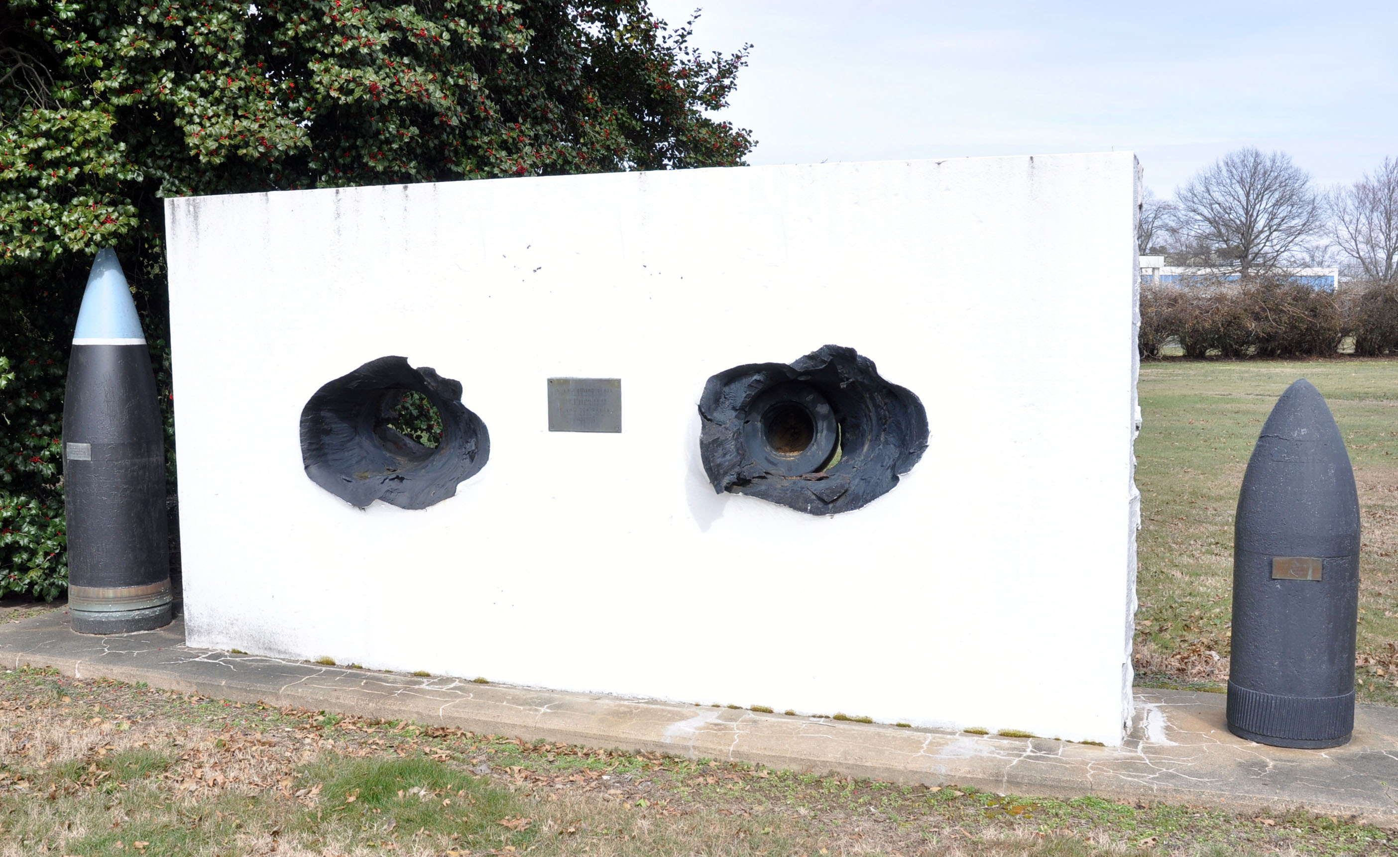 Armor plates of various strengths, thicknesses, and compositions have been tested here over the years to determine how they perform when struck by various types of ordnance. Plates are also used to develop, test, and prove weapons designed to defeat such protection. The 19-inch armor plate on display by A Gate is a sample of one manufactured for the battleship USS Alabama (BB-60) and was part of a test on May 7, 1945. Armor plate such as this was developed to shield the front of the battleship’s 16-inch, 45-caliber gun turrets.