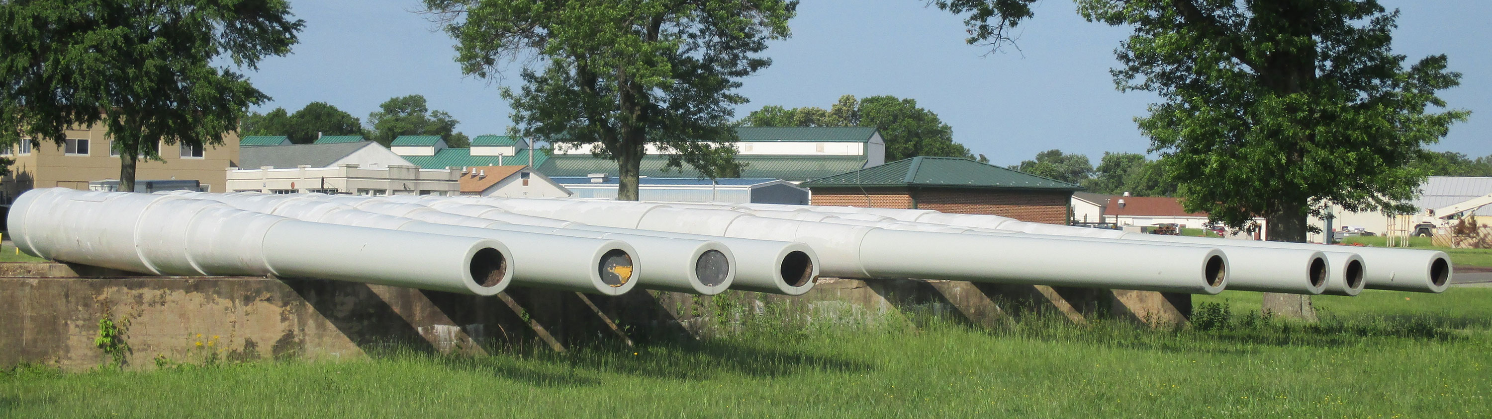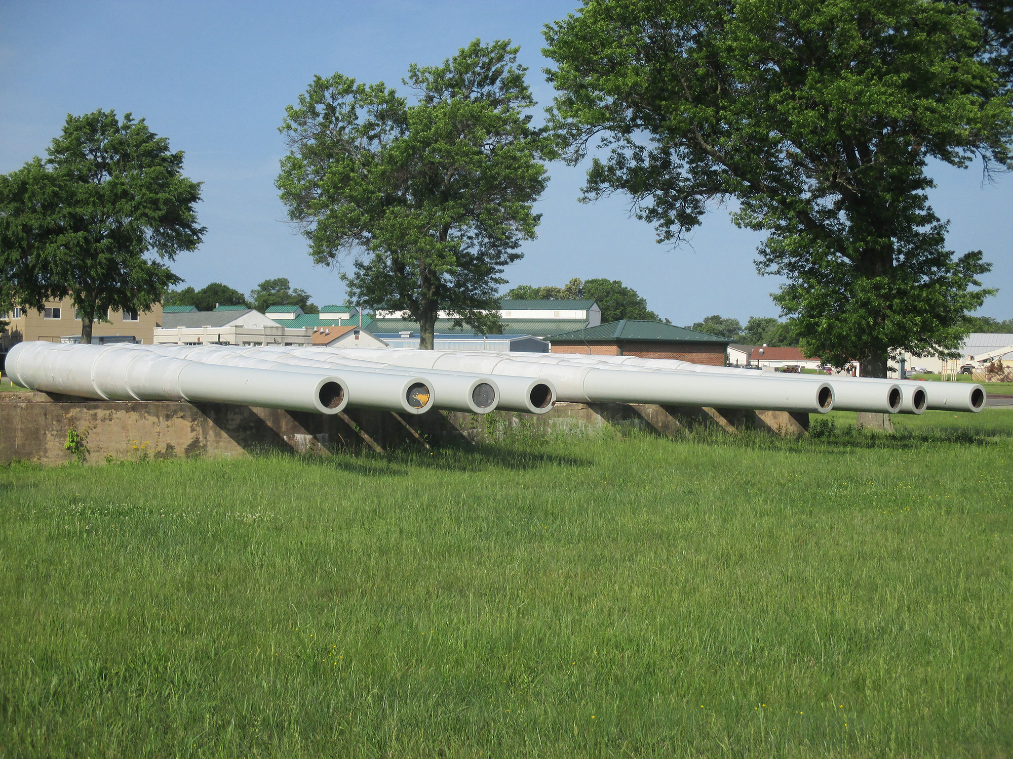 These eight 16-inch battleship gun barrels testify to the days when such ships were the epitome of naval firepower. When Dahlgren tested the 16-inch guns and projectiles, the rest of the base and nearby areas heard and felt these shots and the accompanying reverberations.