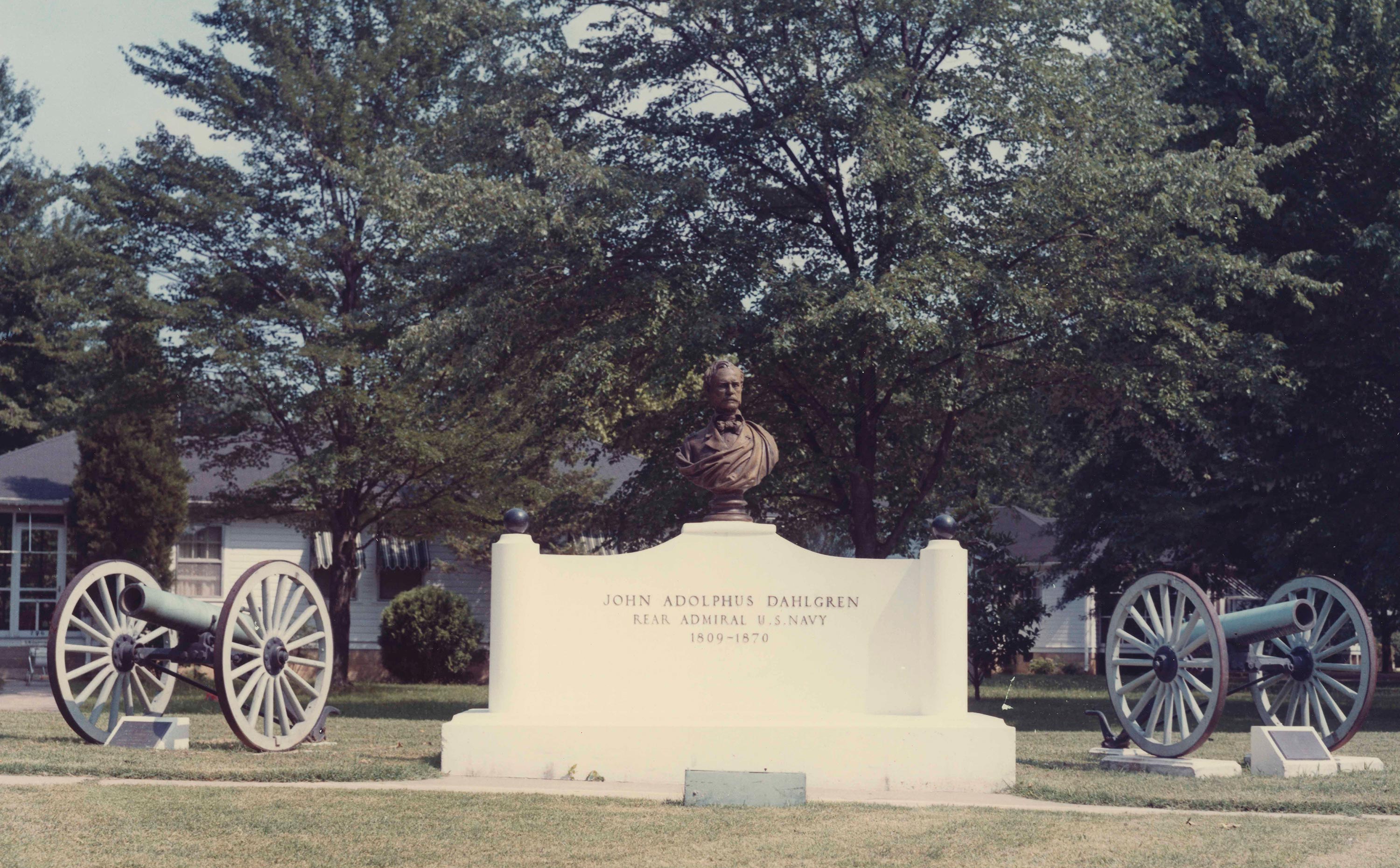 Recognized as “the father of American naval ordnance,” Admiral John Adolphus Dahlgren’s inventive applications of science and engineering during the mid-1800s brought major advances in naval gun safety, reliability, and performance. Check out our earlier blog for more information on his life. Just inside A Gate is the bronze bust of RADM Dahlgren, which was cast from a marble one borrowed from the U.S. Naval Academy Museum and was dedicated on May 27, 1954.
