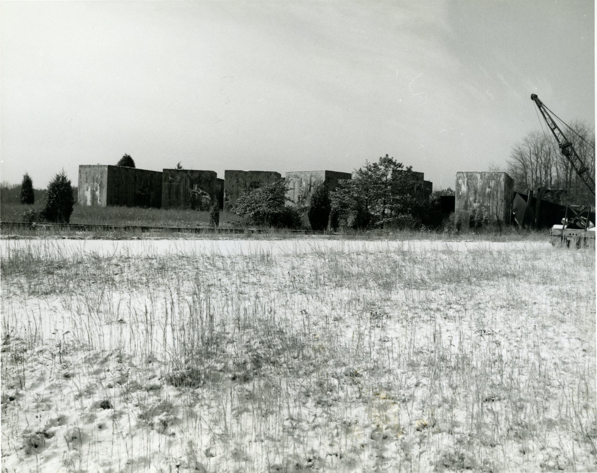 Dahlgren Naval Proving Ground developed test bomb casings for the Elsie (or LC, meaning Light Case) project to produce small, nuclear bombs for carrier-based tactical strikes against hardened underground targets. A rugged, ground-penetrating, relatively lightweight device that could be fitted to naval aircraft and deployed at sea was designed. To simulate the forces of high-altitude air drop, experimental casings were shot from modified 16 inch guns and 14-inch guns toward large, thick concrete target structures, the ruins of which remain today hidden behind the trees at Plate Fuze Battery. Read more about the Elsie Project in our earlier blog.