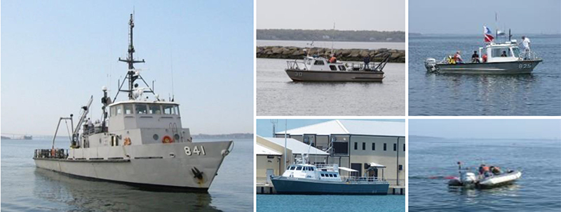 Torpedo retriever/transporter research vessel TWR-841 is both equipped with onboard cranes, large deck spaces, lab space and full amenities and accommodations for extended overnight operations. Other vessels range from small RHIBs to 35-foot work boats that are all outfitted with equipment to support in-water testing. All vessels are highly adaptable to any testing needs.