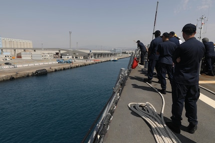 LIMASSOL, Cyprus - LIMASSOL, Cyprus (Aug. 13, 2023) Sailors assigned to Arleigh Burke-class guided-missile destroyer USS Ramage (DDG 61) prepare to moor the ship, Aug. 13, 2023. Ramage is part of the Gerald R. Ford Carrier Strike Group and is on a scheduled deployment in the U.S. Naval Forces Europe area of operations, employed by the U.S. Sixth Fleet to defend U.S., allied, and partner interests. (U.S. Navy photo by Mass Communication Specialist 3rd Class Adriones Johnson)