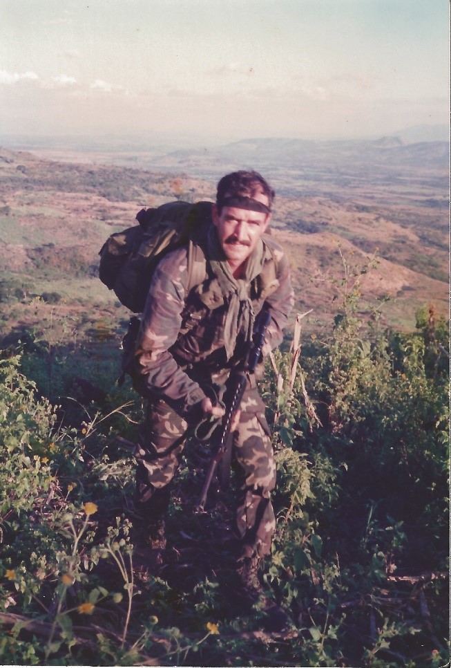 Figure 1: "El Salvador 1986: Gus Taylor accompanying an El Salvadoran patrol in Chalatenango Province, El Salvador as a combat advisor in late 1986."