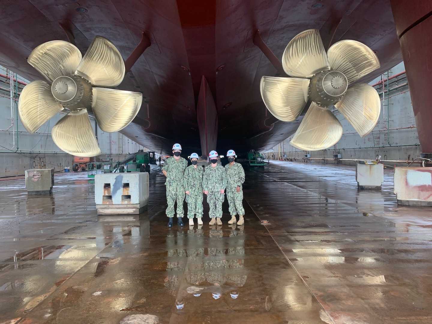 During it’s time in dry-dock the ship began the cleaning and pumping of all tanks and voids, completed the cleaning of auxiliary sea water and generator sea water piping systems, as well as conducted underwater hull preservation.
