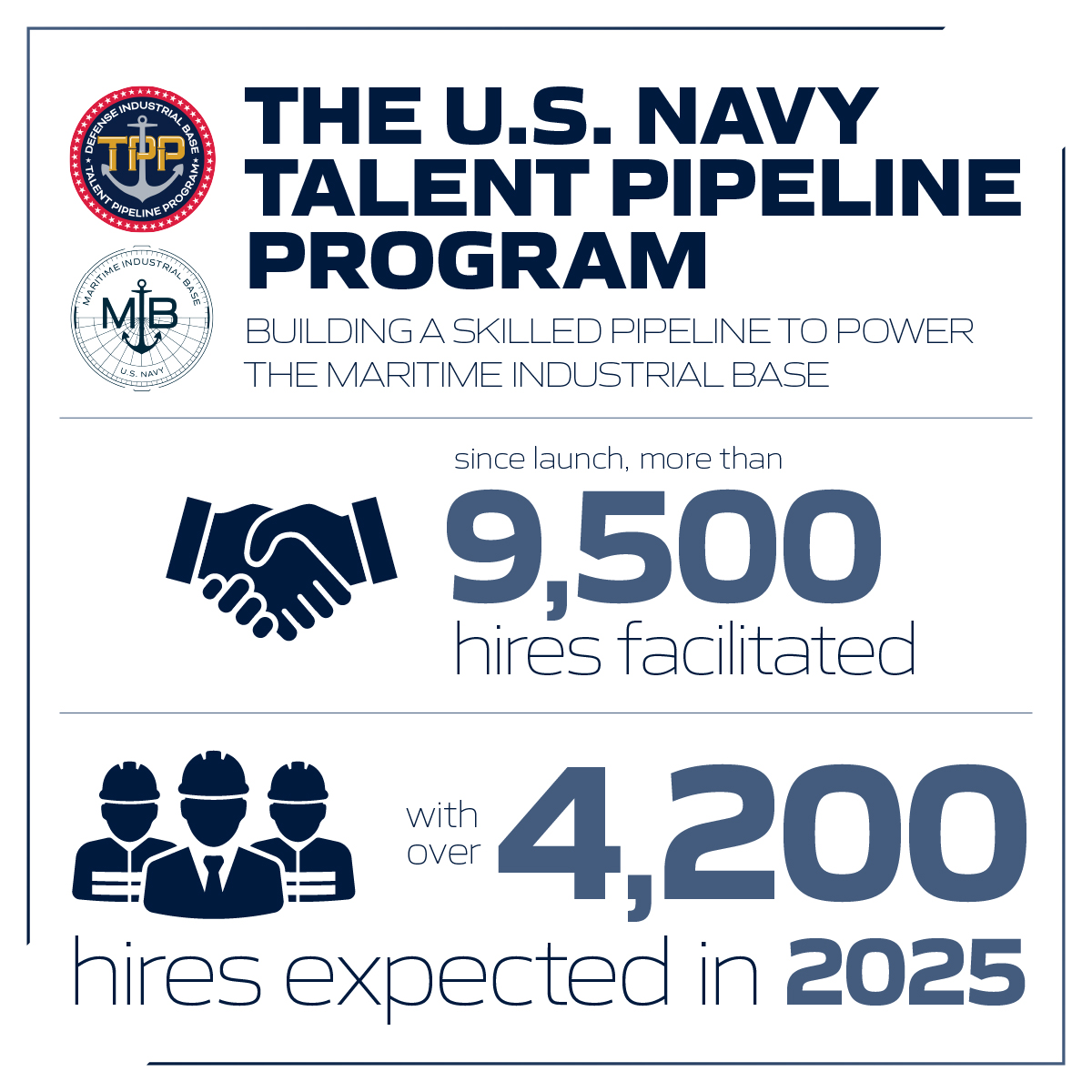 In May and June, the U.S. Navy’s Talent Pipeline Program (TPP) will recognize the individuals, employers, and training partners driving this workforce initiative, kicking off the third year of a program now aligned under the Navy’s expanded Maritime Industrial Base (MIB) Program.