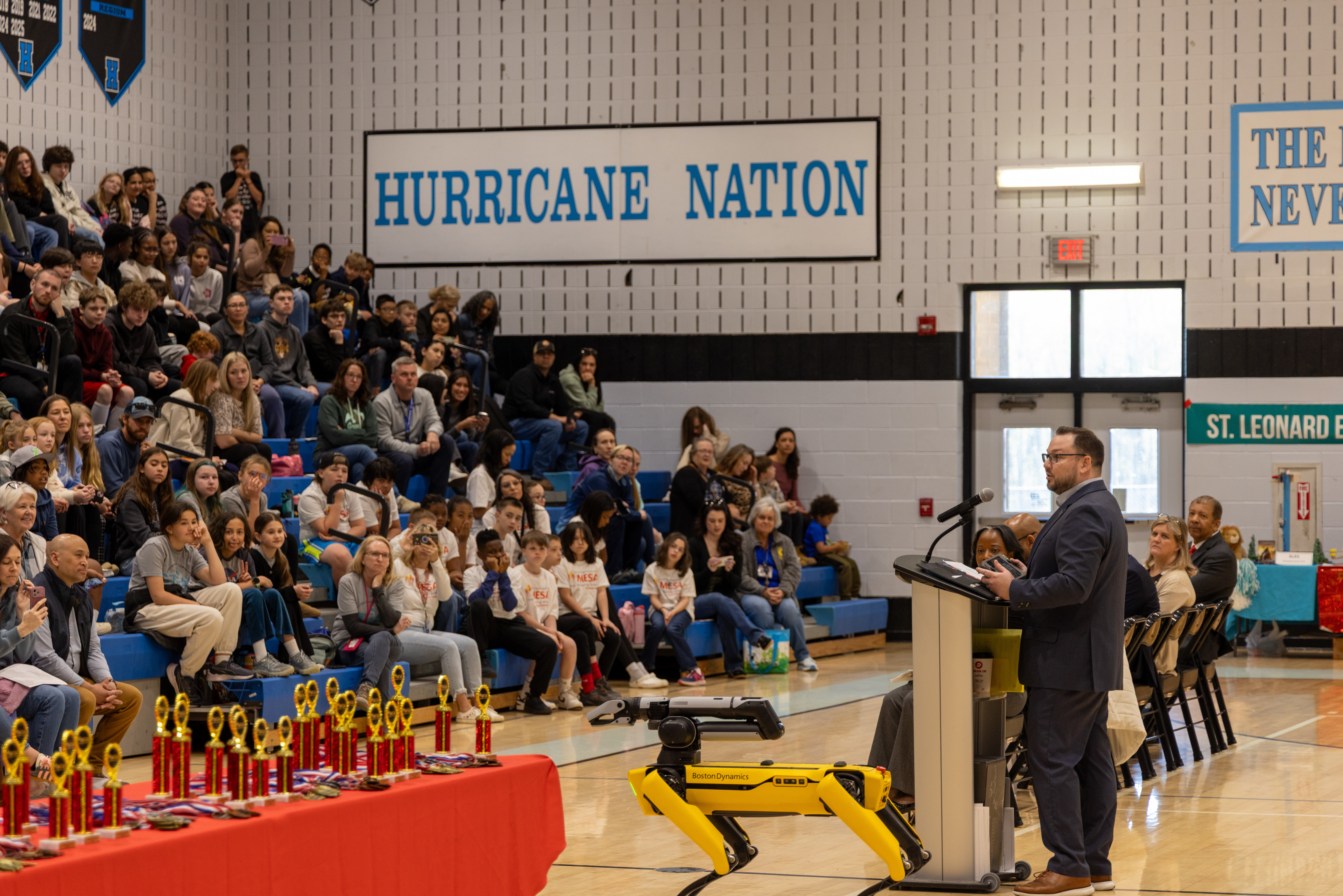 Dr. Shane Wines, an Albert Einstein Distinguished Educator Fellow supporting the Department of the Navy at Carderock, delivered the keynote speech to 216 students from 14 schools. To illustrate the real-world application of science, technology, engineering and math (STEM) concepts, students were visibly excited as Wines demonstrated the capabilities of a Boston Dynamics robot dog during his speech. The demonstration, which included the robot performing automated tasks like walking up stairs and opening a door, offered a vivid example of how technology can be used for ethical co-creation and thoughtful problem-solving.