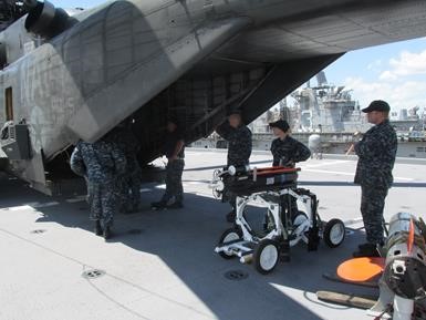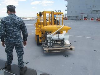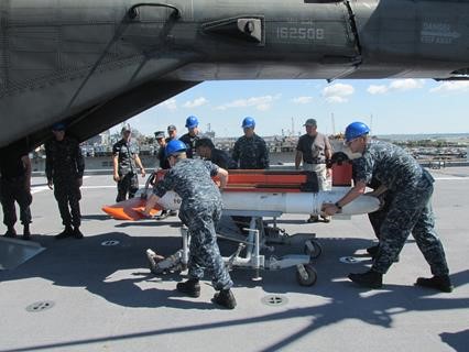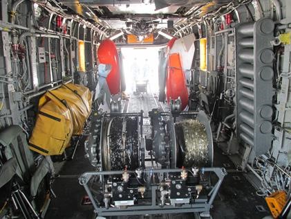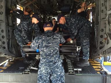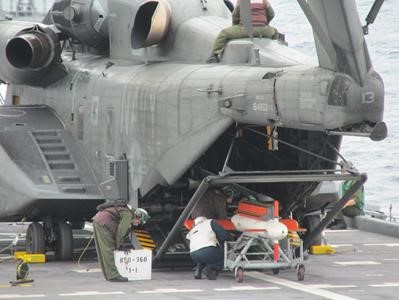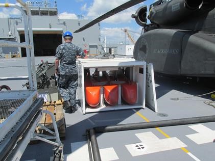 Figure 12: USNS Lewis B. Puller (T-ESB 3) demonstrates that the ship can support the configuration, installation, removal and reconfiguration of the Airborne Mine Neutralization System SEAFOX. The SEAFOX is a remotely operated vehicle designed to locate and attach disposal charges to mines. The T-ESB 3 provides two SEAFOX magazines with a capacity to hold 50 rounds each. Special ordnance handling equipment is used to transport the explosive rounds from the SEAFOX magazines to the helicopter where it is installed and integrated with the SEAFOX control system console also loaded into the helicopter.