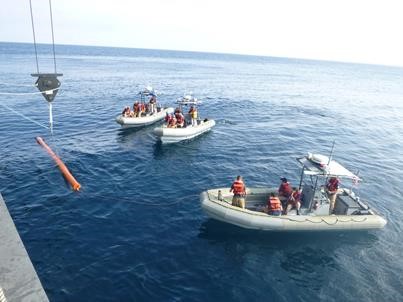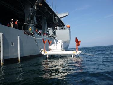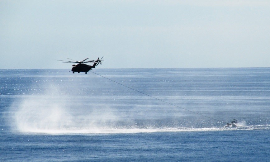 Figure 14: USNS Lewis B. Puller (T-ESB 3) demonstrates that the ship can launch and recover the AN/SPU-1W Magnetic Orange Pipe minesweeping system. The Magnetic Orange Pipe, which is magnetized on deck of the T-ESB prior to deployment, is used to influence magnetic mines in littoral waters and rivers. It is lowered to the water independent of being attached to the MH-53E helicopter. Once in the water, the Airborne Mine Countermeasures 7m Rigid Hull Inflatable Boats tow the system away from the ship where it’s connected with the MH-53E for its towing mission.