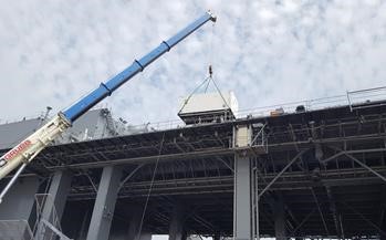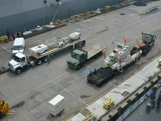 Figure 10: USNS Lewis B. Puller (T-ESB 3) demonstrates that the ship can support the configuration, installation, removal and reconfiguration of the AN/AQS-24A mine hunting sonar system. The AN/AQS-24A utilizes a special workshop consisting of three Military Vans that connect together to form a large work space. They are secured on the flight deck allowing calibration of specialized equipment to take place prior to loading into the MH-53E to conduct its mission.