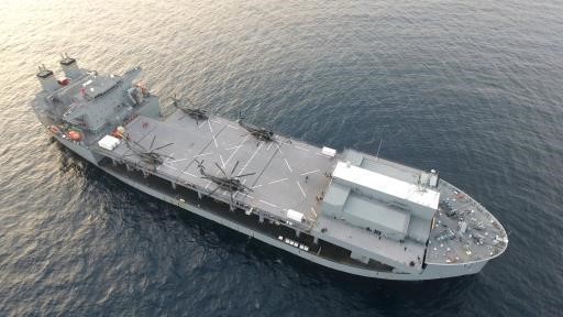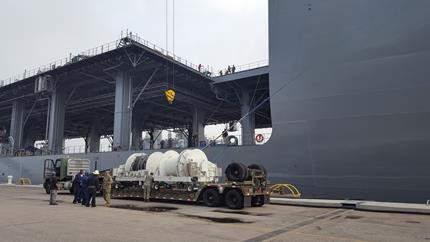 Figure 3: USNS Lewis B. Puller (T-ESB 3) is capable of onloading, storing, and offloading Airborne Mine Countermeasures equipment up to 10 metric tons. Larger gear weighing more than 10 MT can be on-loaded with the support of shore side Material Handling Equipment. |
